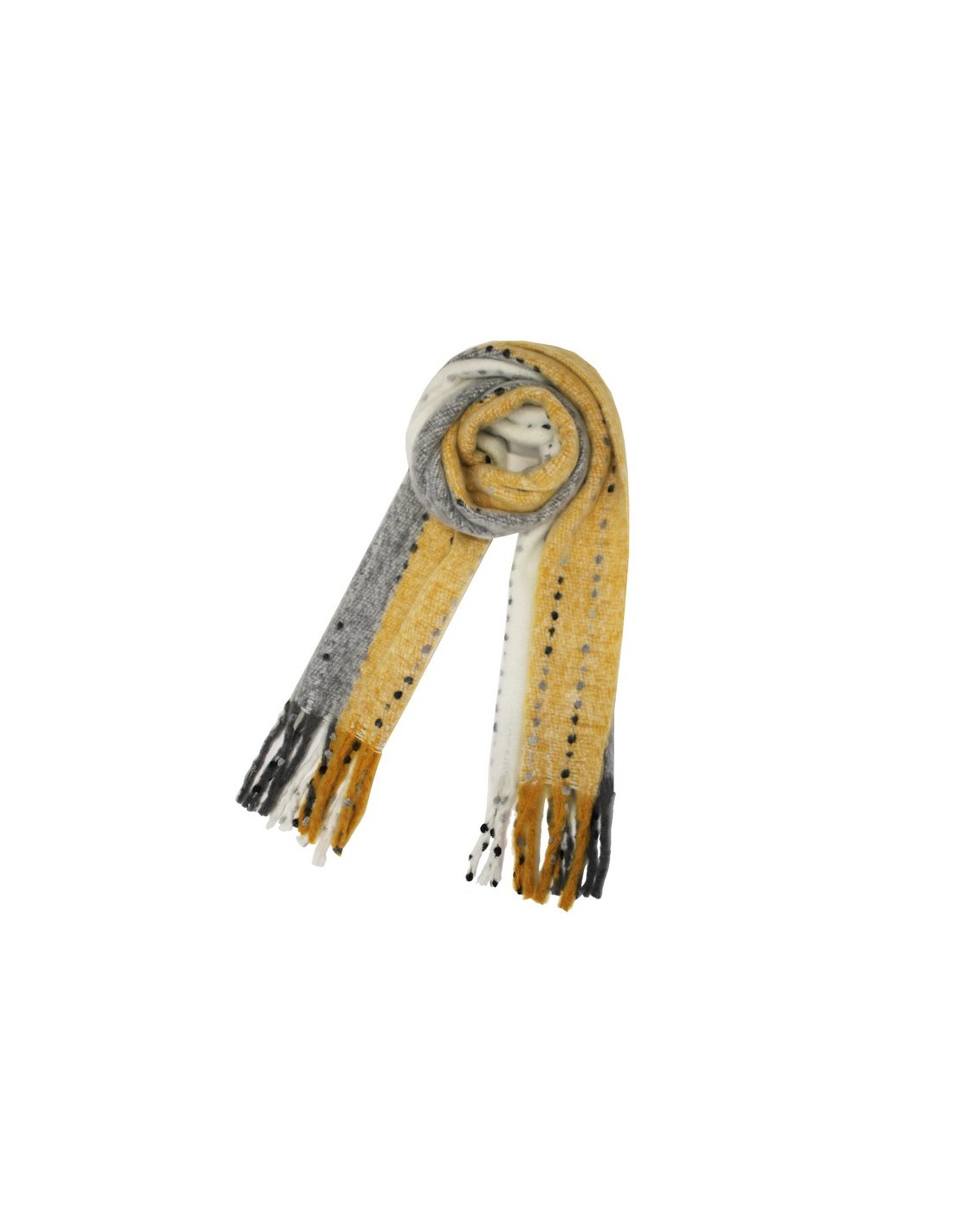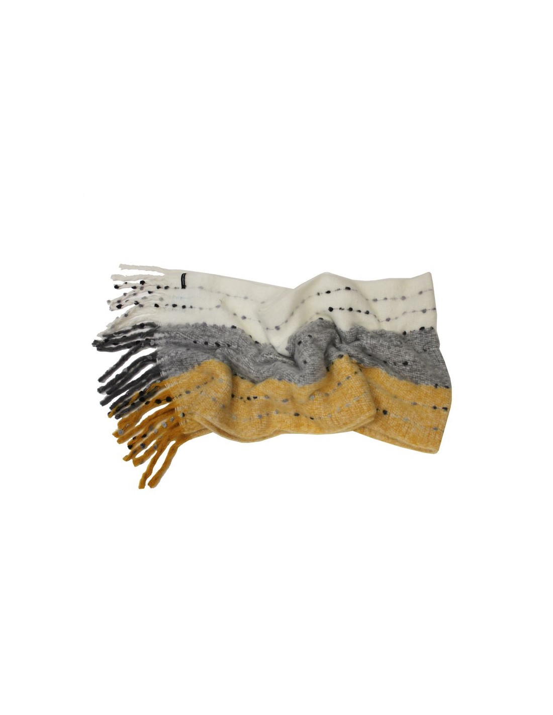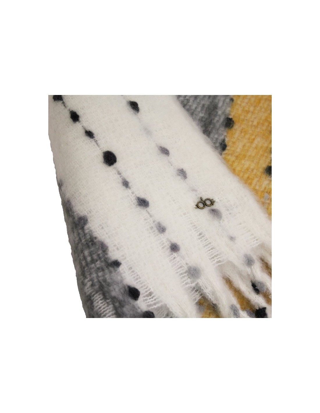 Diseñada en forma rectangular y con un estampado en gris blanco y amarillo, haciéndolo muy combinable con cualquier outfit, esta temporada. Detalle de bonitos flecos en los laterales. Con un tacto muy suave y agradable.