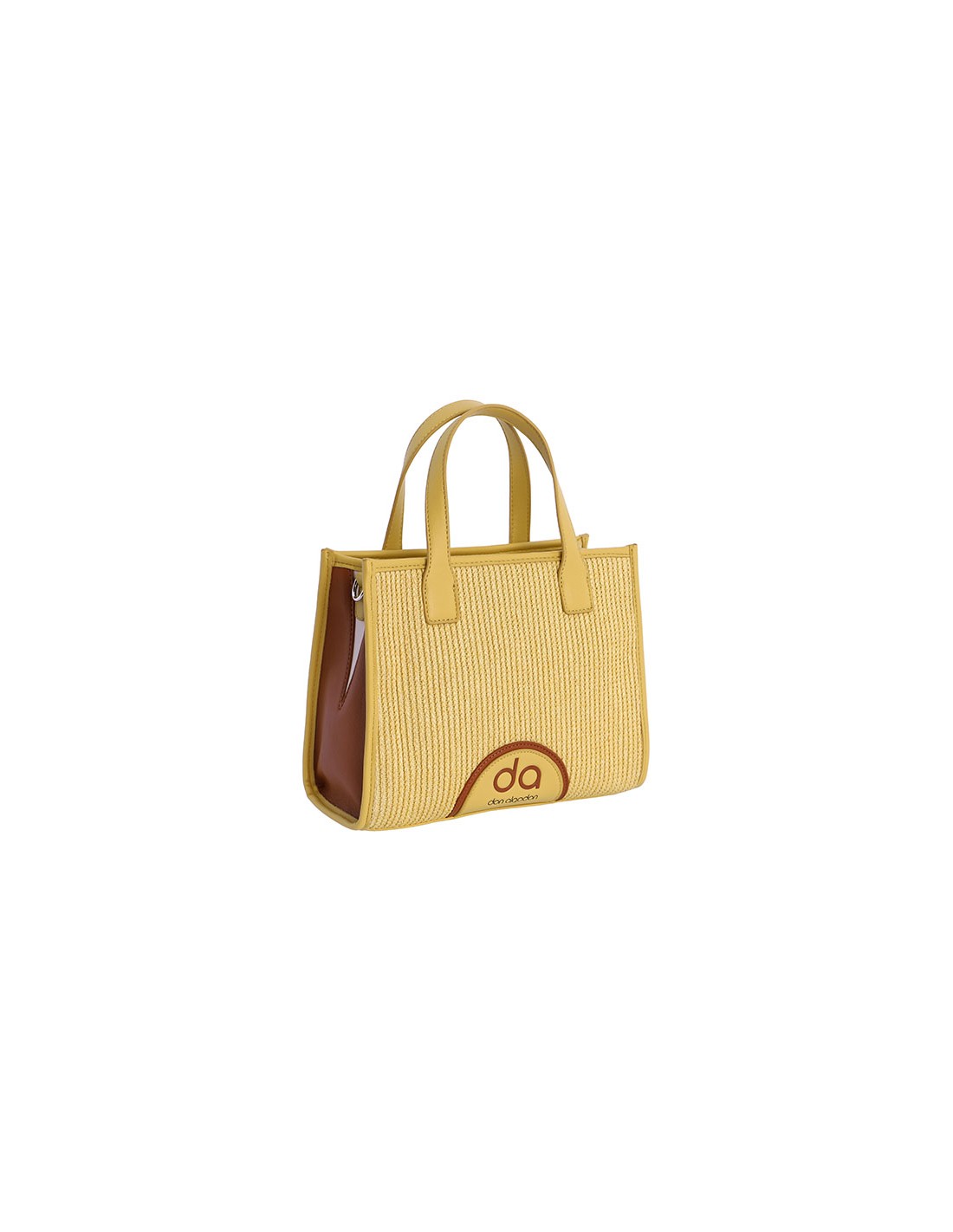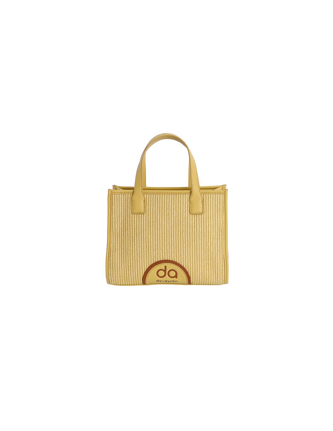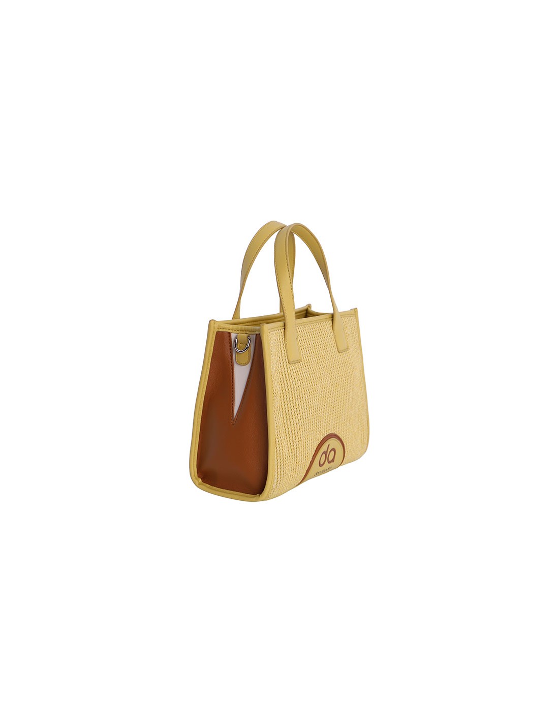 Combina rafia y detalles en piel sintética en amarillo con beige y marrón, haciéndolo en un diseño muy original. Tiene un compartimento con cierre de cremallera en la parte trasera. Su bolsillo principal con cierre de cremallera y si interior forrado en textil logotipado con compartimentos en los laterales.