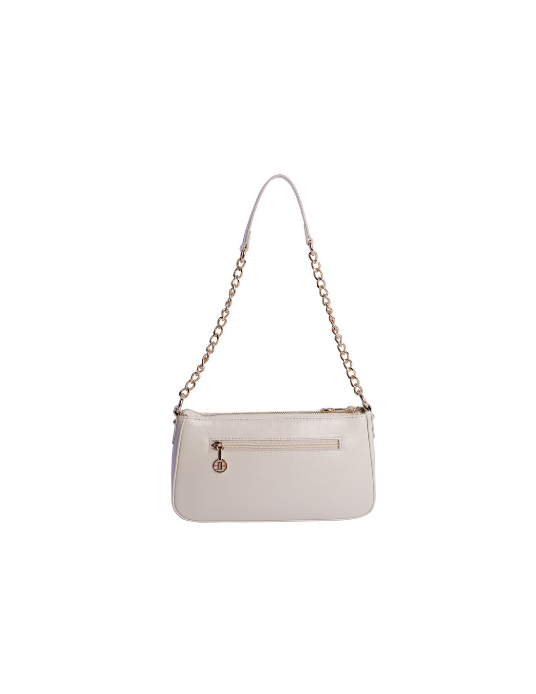 De un tamaño mediano y en formato baguette. Tiene un compartimentos con cierre de cremallera en la parte trasera. Su bolsillo principal es con cierre de cremallera y su interior forrado en textil y con un compartimento en cada lateral.  Su asa es bandolera combinada con eslabones dorados con piel sintética a tono. Logo en metal dorado en la parte frontal.