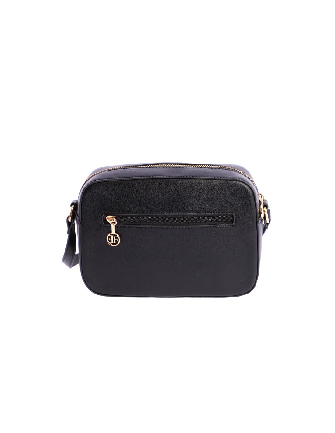 Tiene un compartimentos con cierre de cremallera en la parte trasera. Su bolsillo principal es con cierre de cremallera y su interior forrado en textil y con un compartimento en cada lateral. Su asa es bandolera es regulable y de piel sintética al tono. Original logo en metal dorado en la parte frontal.
