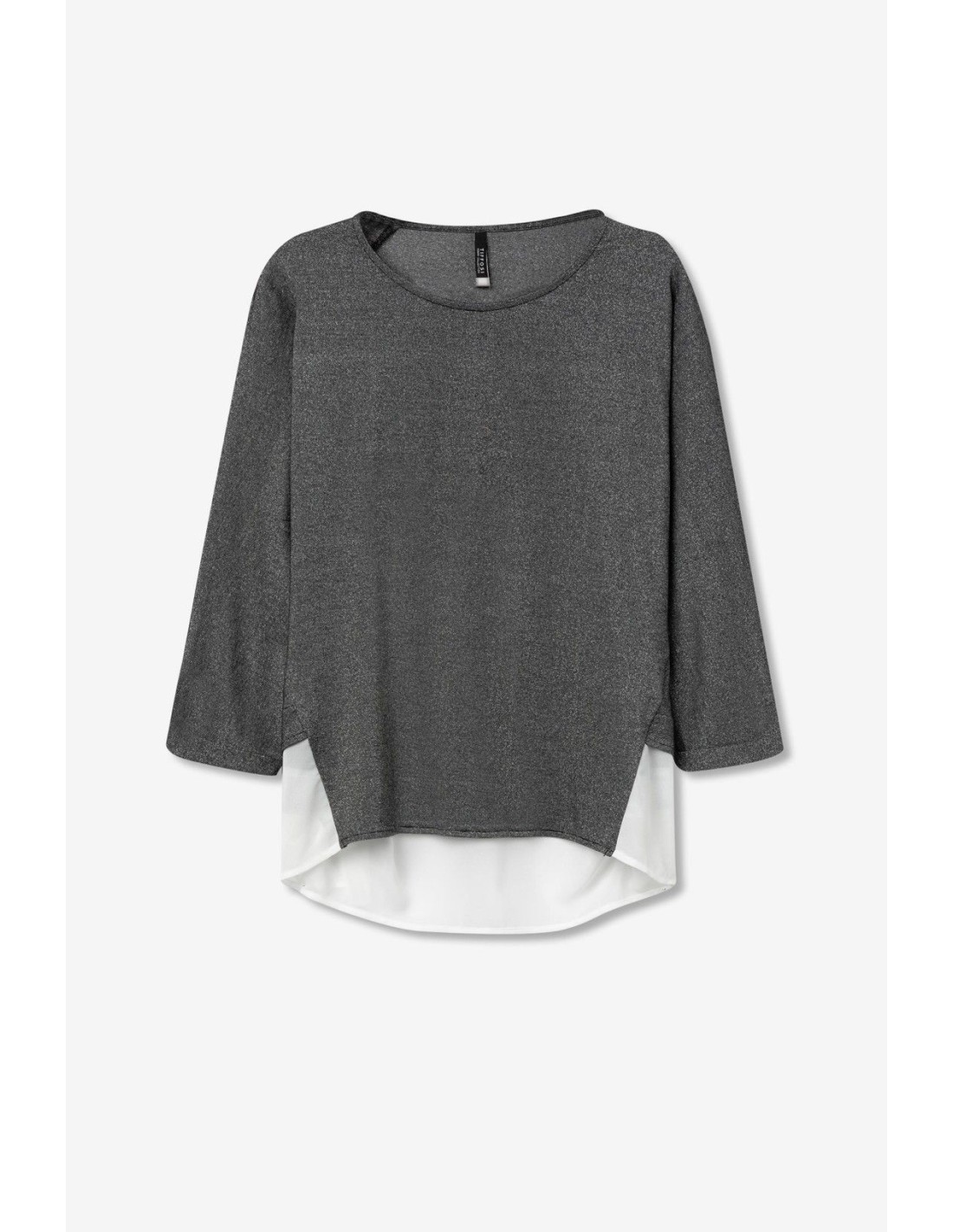 Original jersey combinado de punto fino, cuello redondo, manga larga  y con detalle de hilo metálico, dándole un toque especial y elegante. Bajo acabado en blanco , un contraste muy original, de la colección MIRANDE de la nueva colección de la firma TIFFOSI.