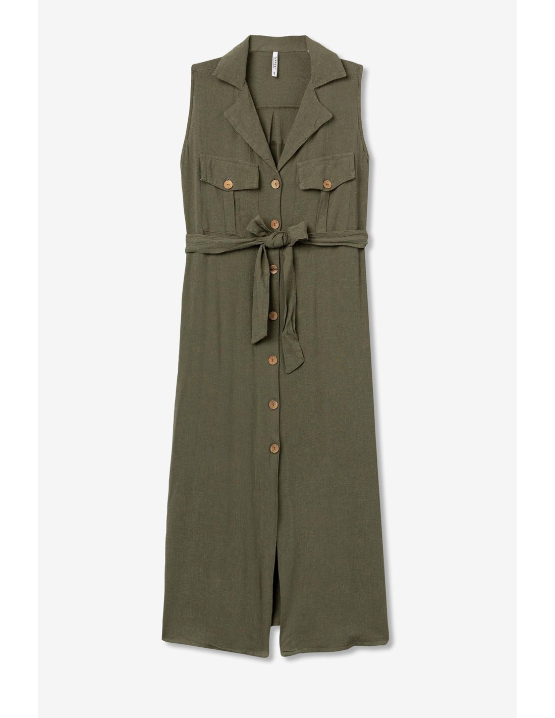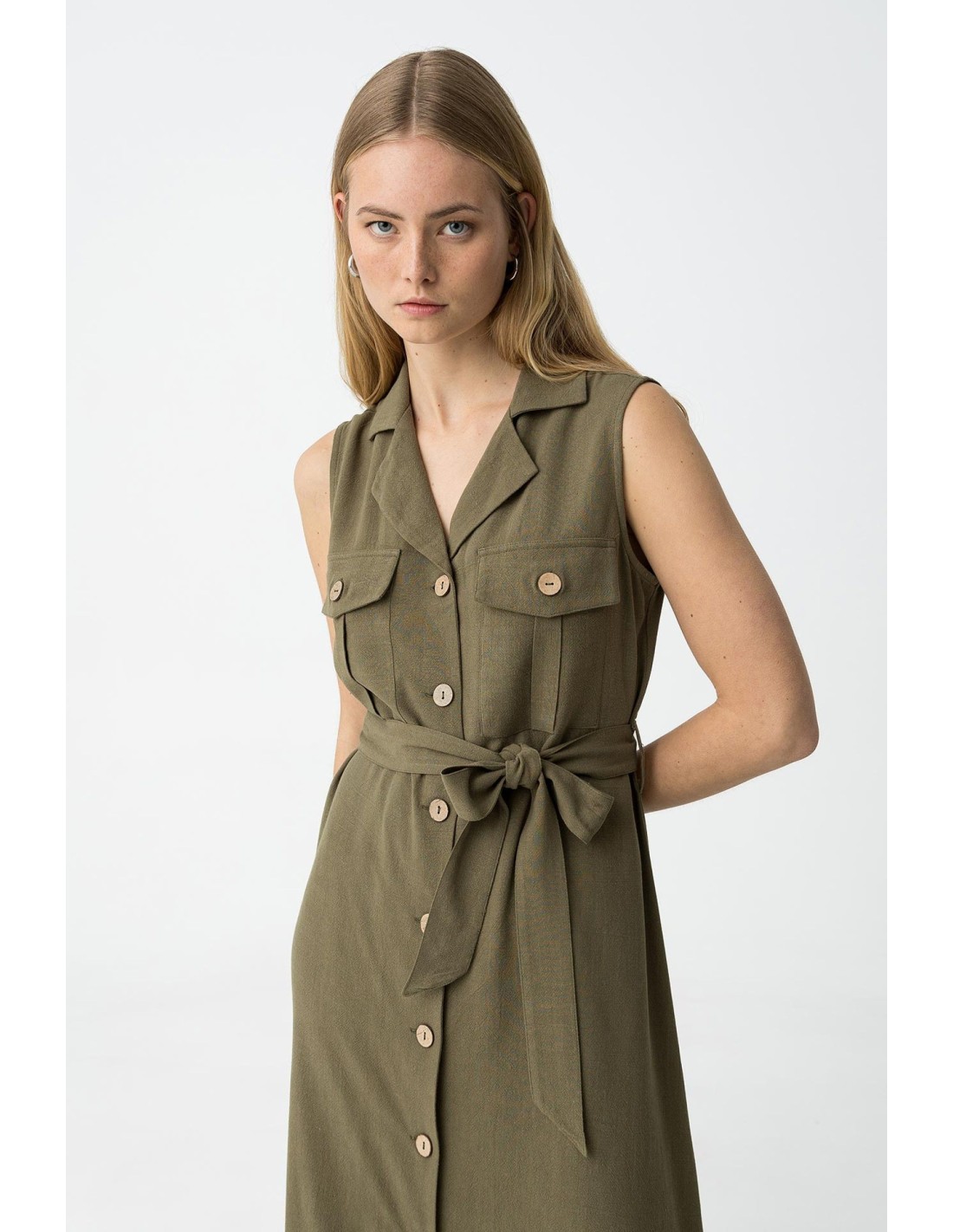 Un vestido confeccionado en mezcla de lino . Con cuello de solapa en pico y mangas de sisa, Su cierre es con botones dorados en la parte frontal. Además con cinturón en el mismo tejido con hebilla dorado.