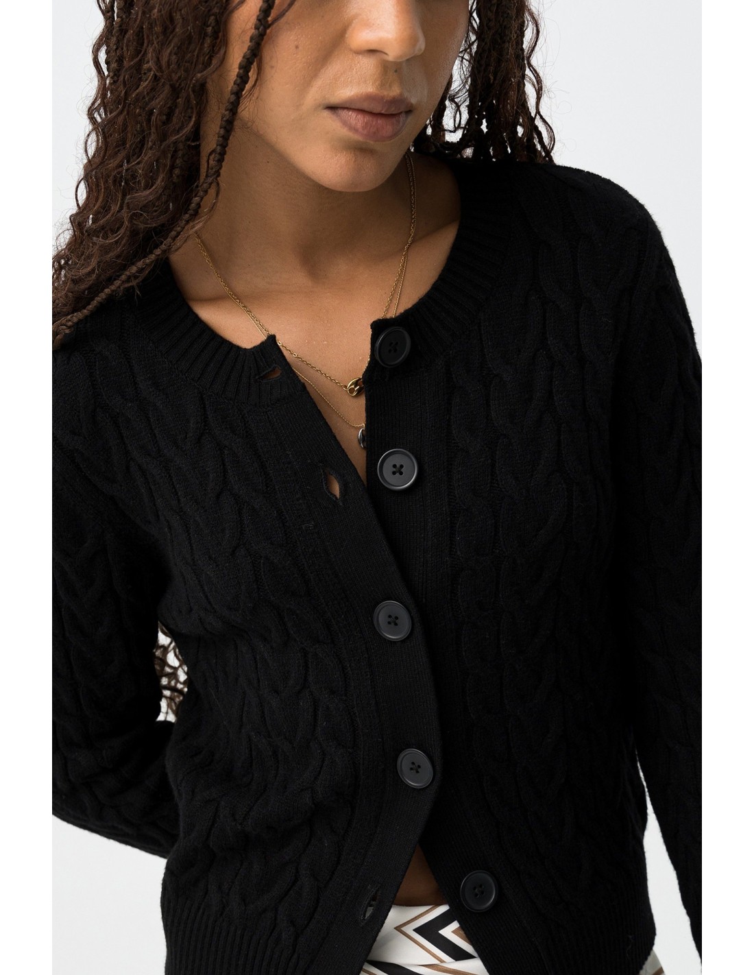 Con cierre de botones, cuello redondo y manga larga.