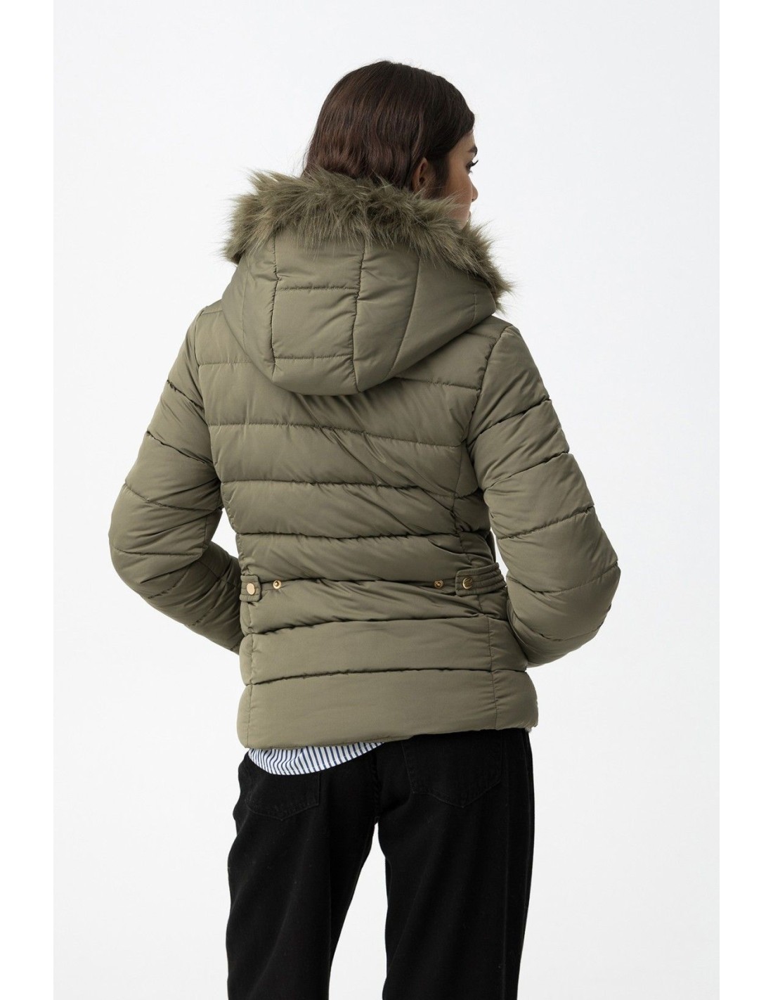 Abrigada chaqueta acolchada en color verde militar, con bonita capucha con pelo, cierre de cremallera dorada y bolsillos frontales con cierre de cremallera. De corte regular y con un estilo moderno. Colección FEED de TIFFOSI.