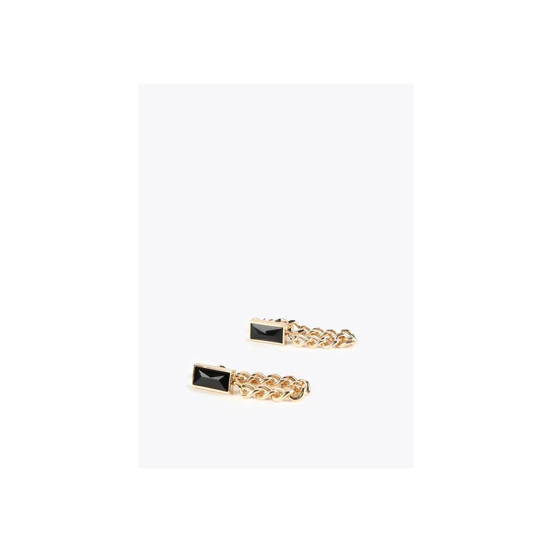 Diseñado con una pieza en negro en la parte del cierre en el que cuelga una cadena dorada con pequeños eslabones. Apliques metálicos en dorado.