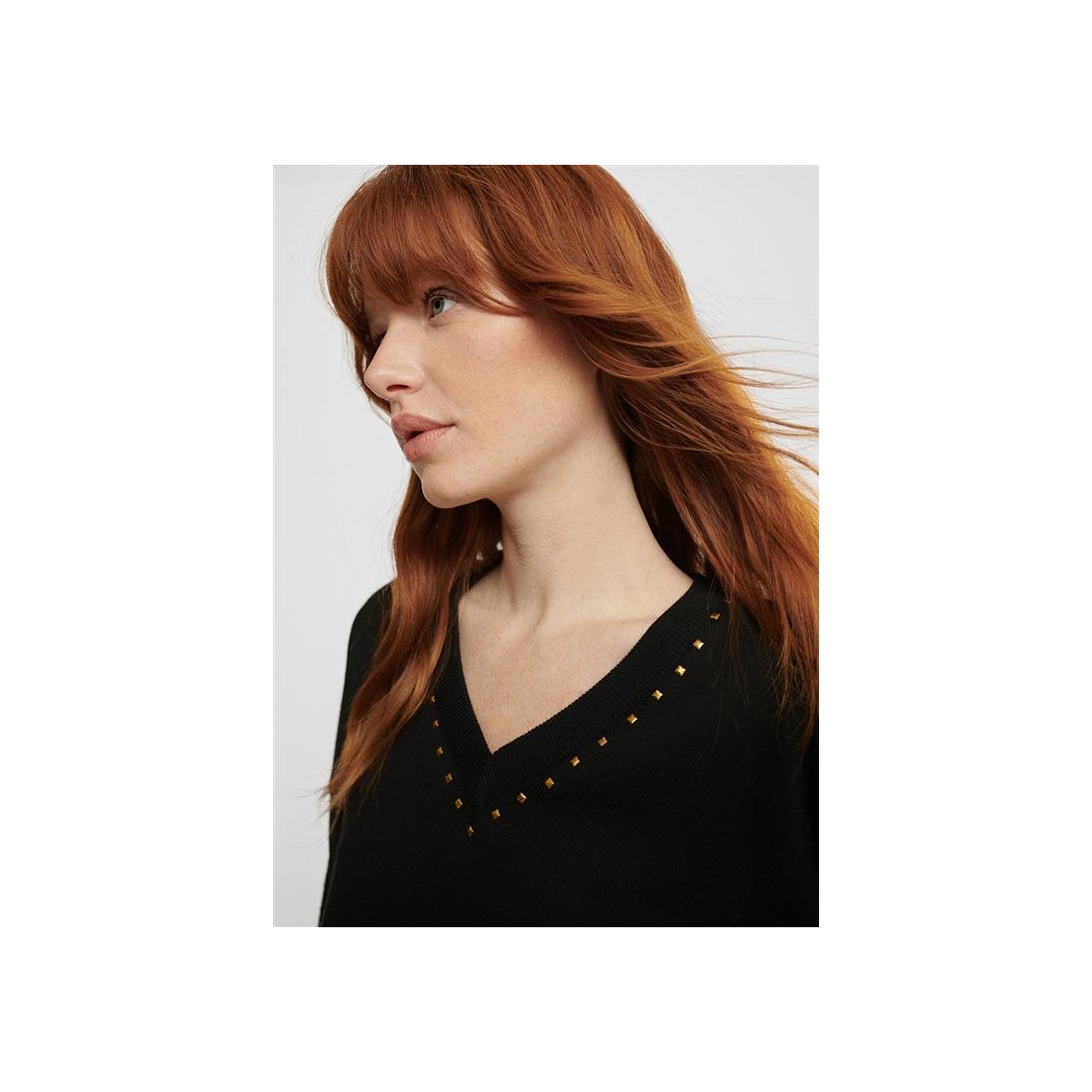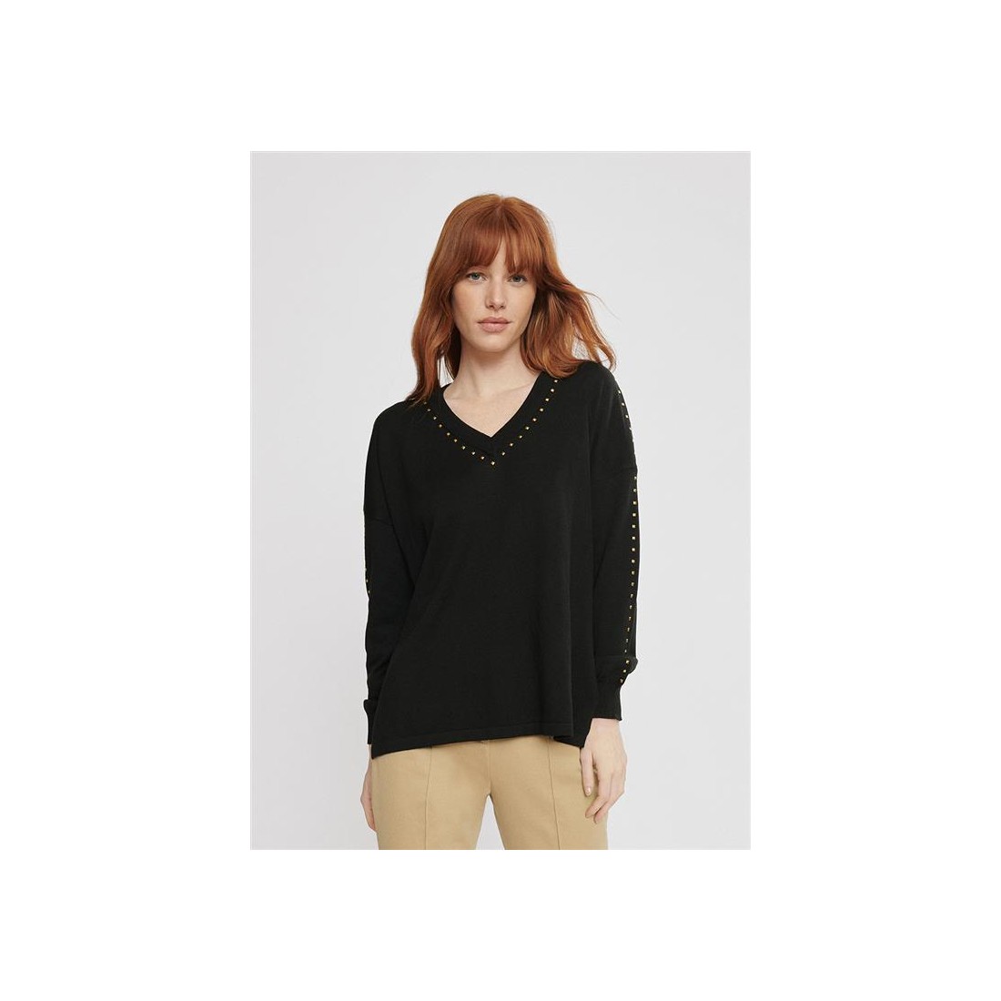 Diseñado en punto con cuello de pico.  Con detalle de tachuelas doradas en mangas y cuello dándole un toque especial.