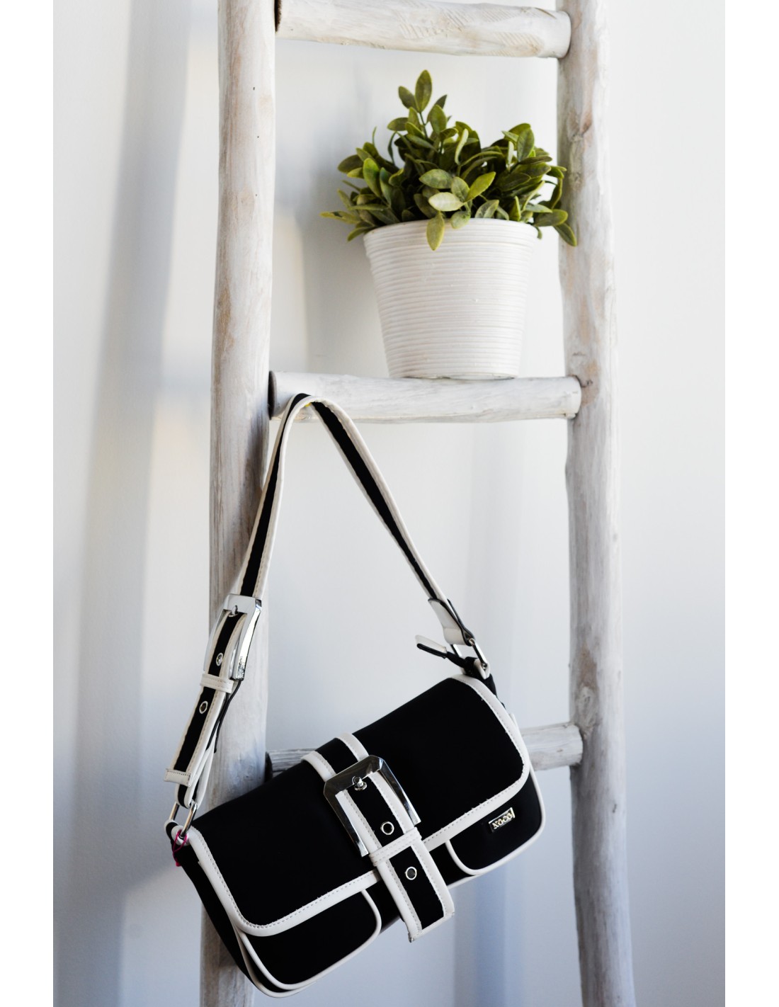 Fabricado en neopreno negro de alta calidad combinado con detalles en piel vegana blanca, aportando un contraste único. Su bolsillo principal con solapa y con cierre de hebilla en plata , un detalle ideal al igual que en la asa bandolera .