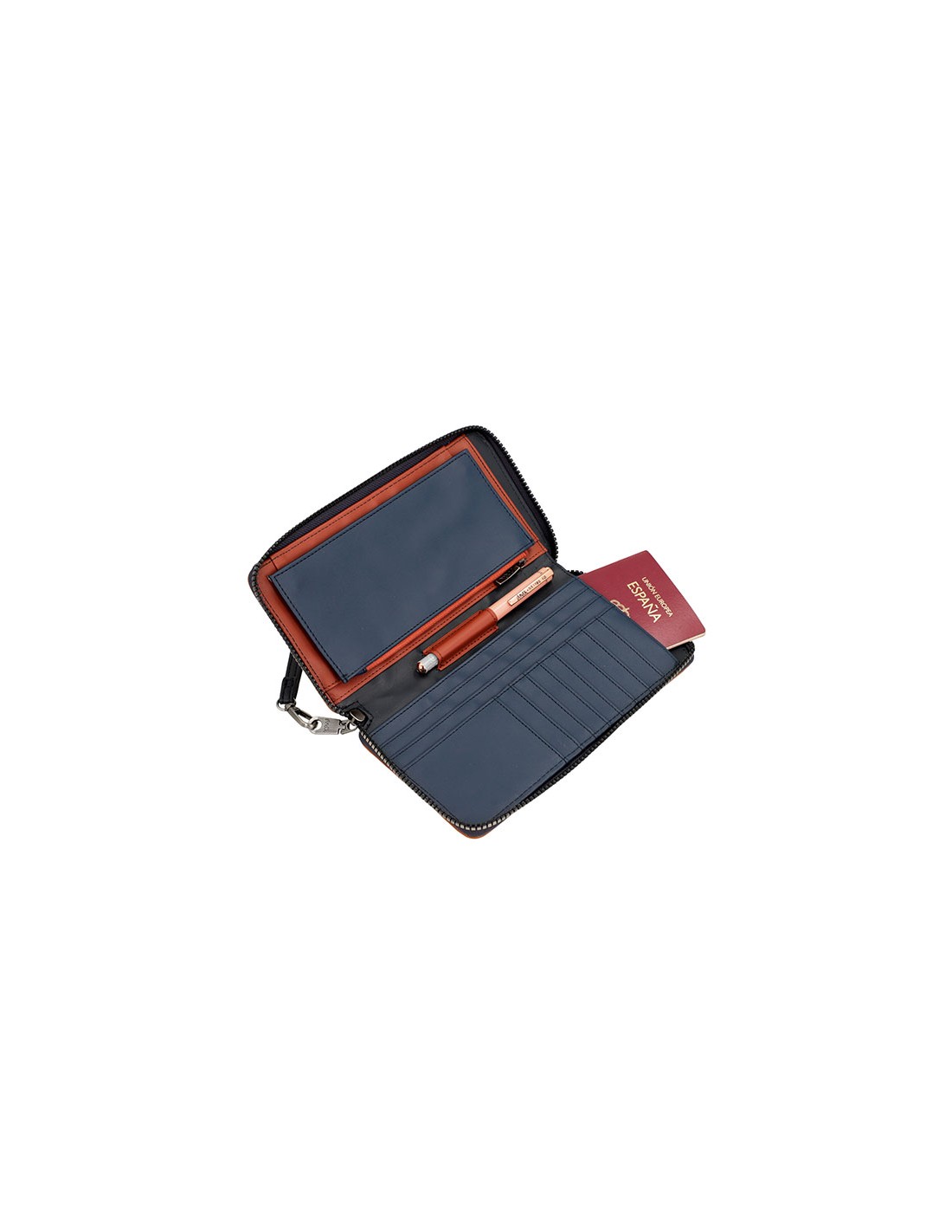 Diseñada en tamaño grande perfecto para viajar. Un modelo muy cómodo que se abre mediante cremallera, con interior forrado y cuenta con diversos compartimentos para tarjetas, pasaporte y un bolsillo con cremallera para las monedas. En el centro tiene un compartimento para poder llevar un bolígrafo ( no incluido ). Además cuenta con una cómoda asa de mano que se incorpora en el tirador.