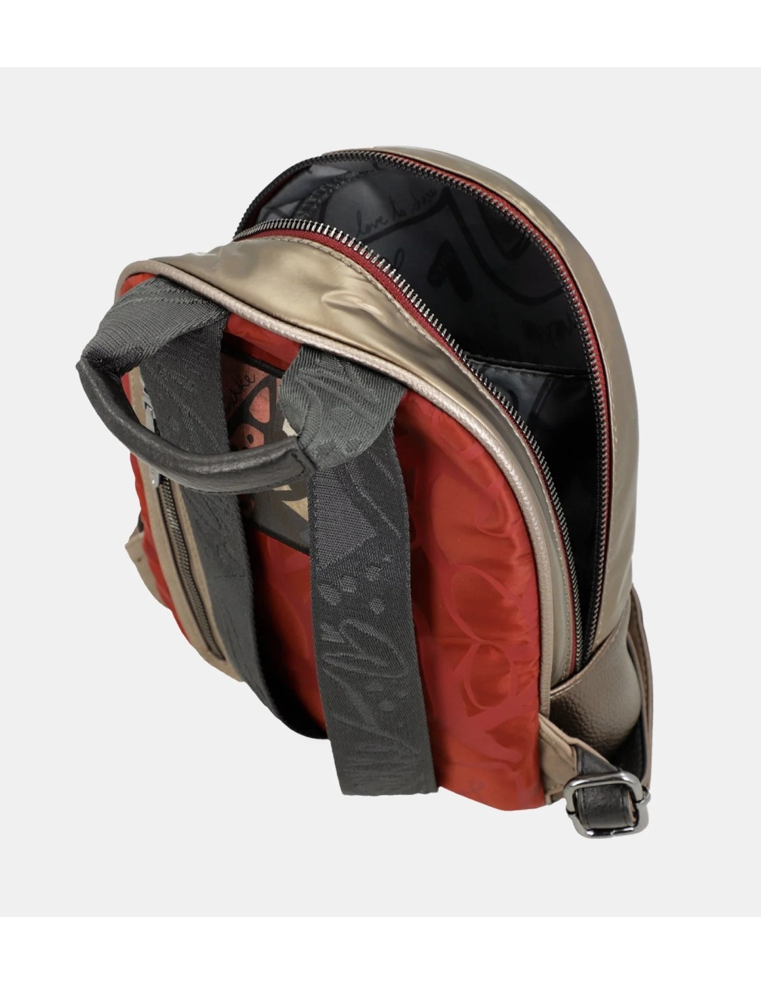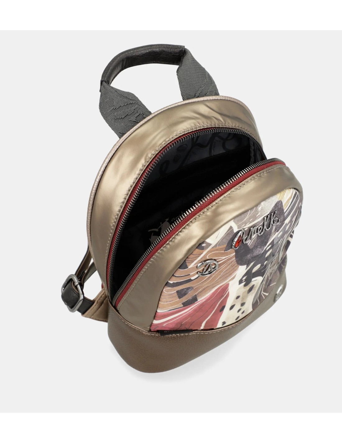 Mochila con un diseño sencillo y de tamaño pequeño. Con un bolsillo principal con cierre de cremallera y su interior forrado y con pequeños compartimentos en los laterales. Tiene un departamento vertical con cierre de cremallera en la parte trasera. Con dos asas regulables para poner a modo bandolera y un asa de mano en la parte superior.