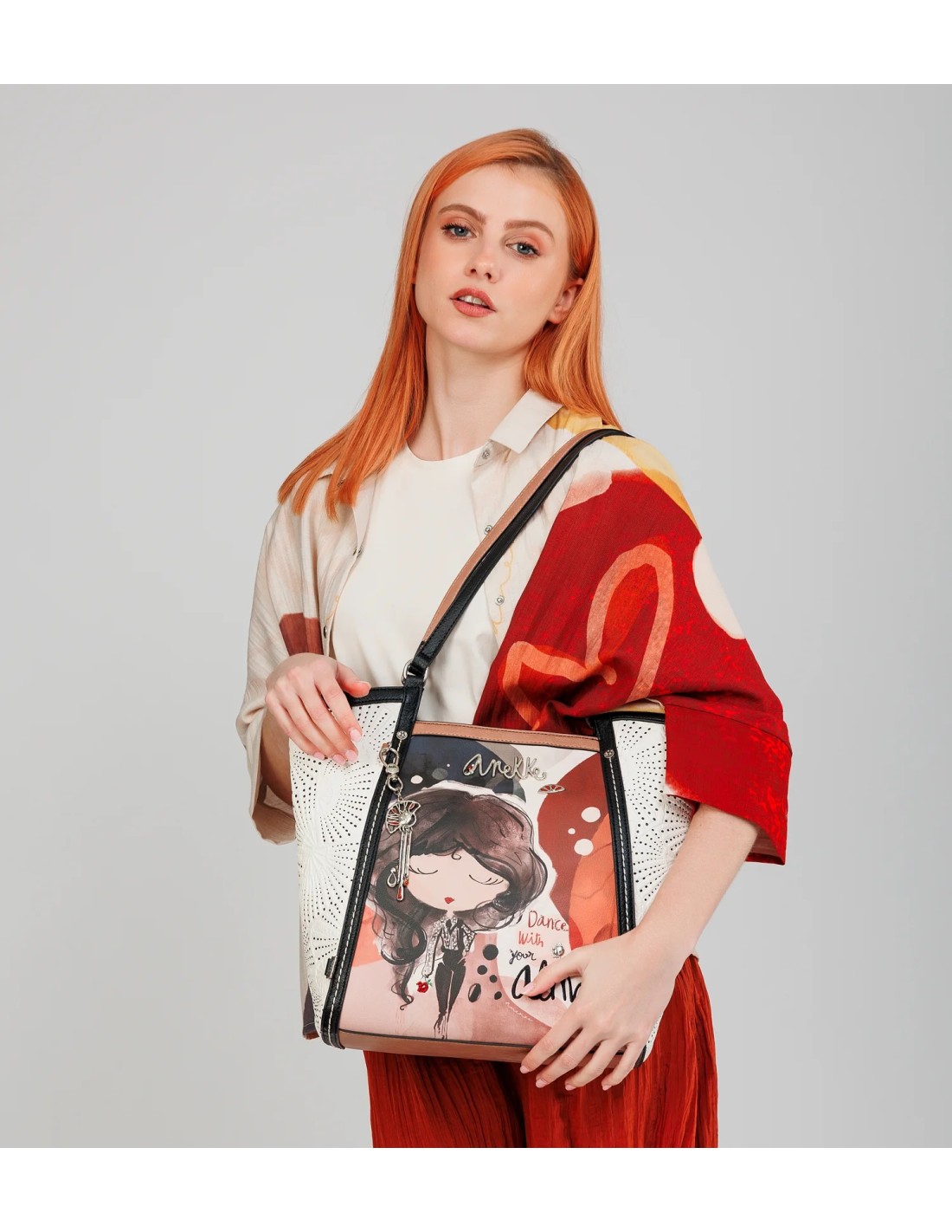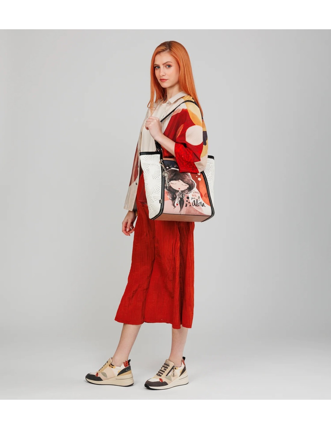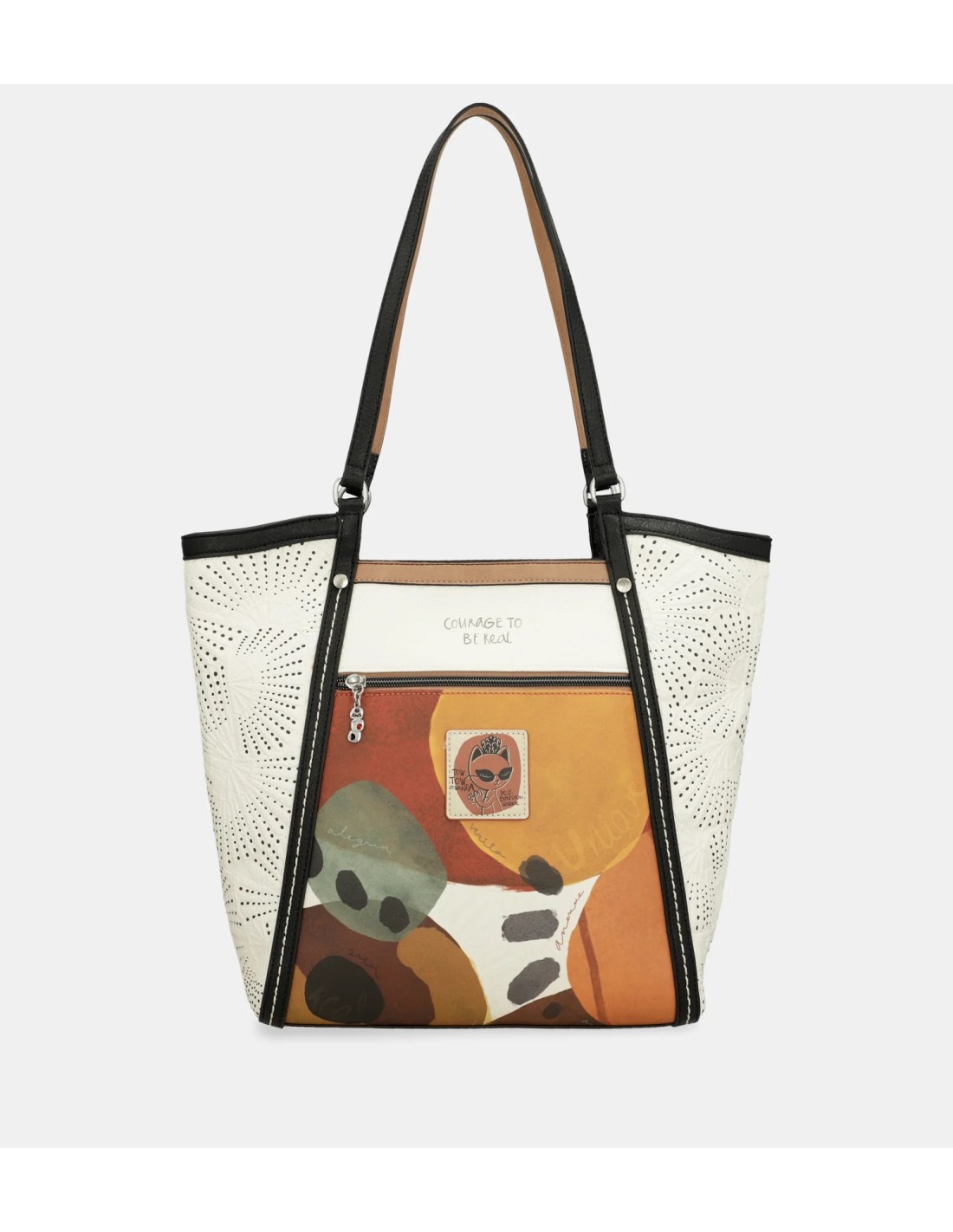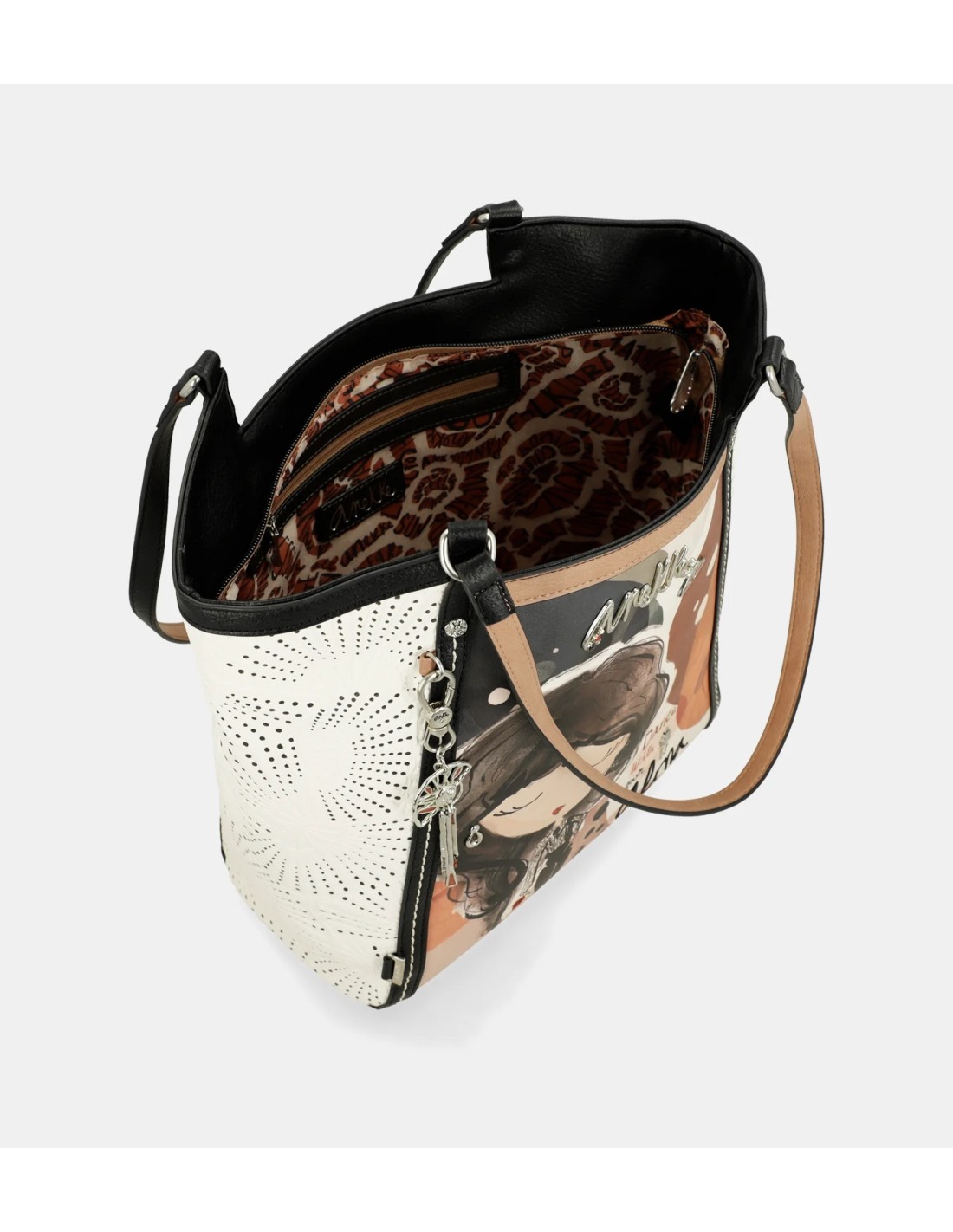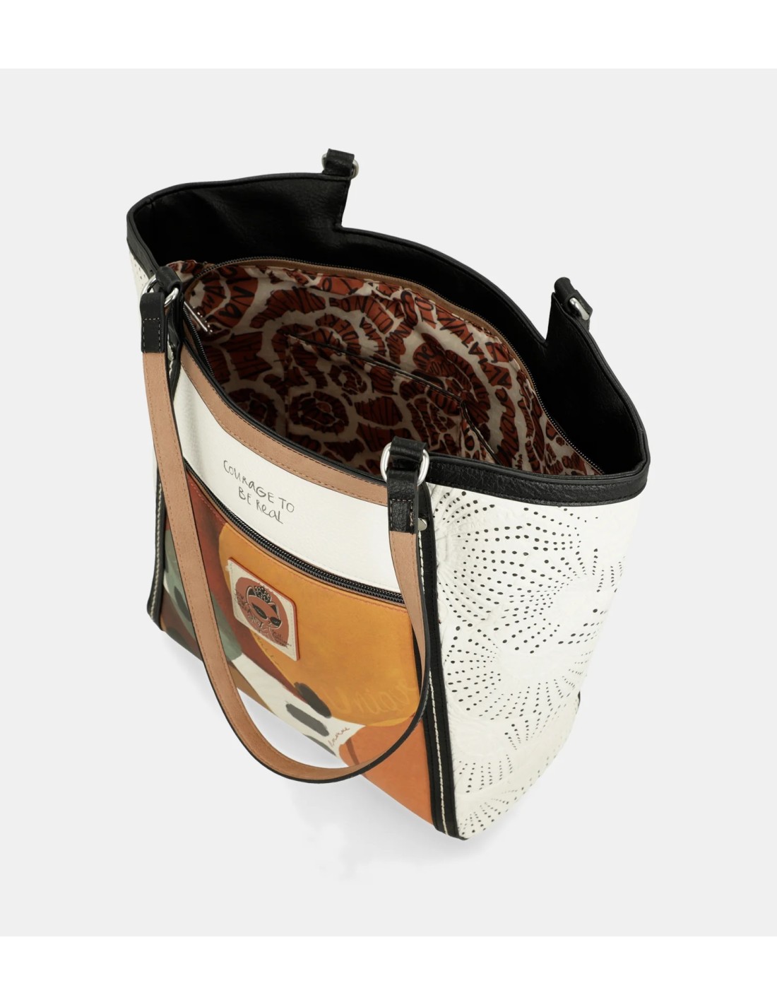 Diseñado de un tamaño grande. Cuenta con un compartimento con cierre de cremallera en la parte trasera. Su bolsillo principal con cierre de cremallera y su interior está forrado con un original tejido estampado con motivos de la colección, y cuenta con bolsillos. Con dos asas ámplias para llevarlo en los hombros cómodamente.