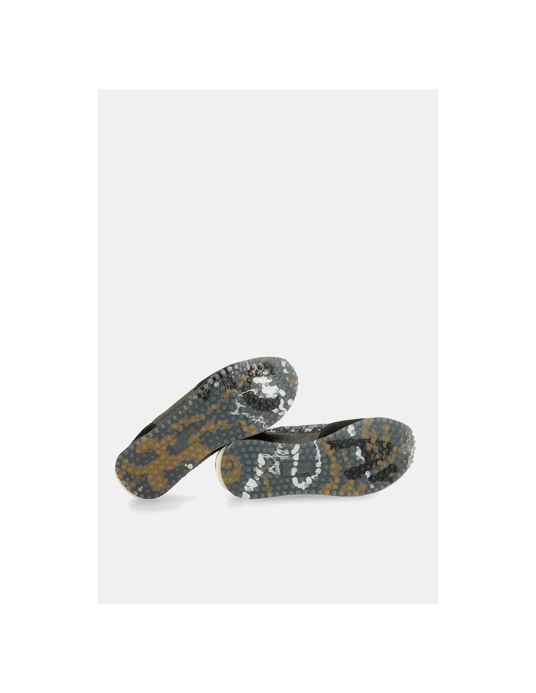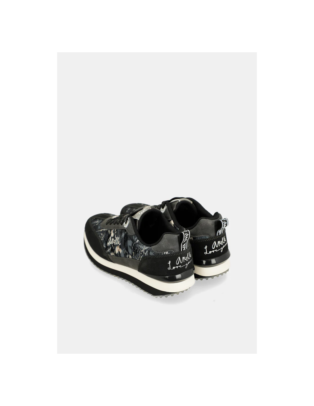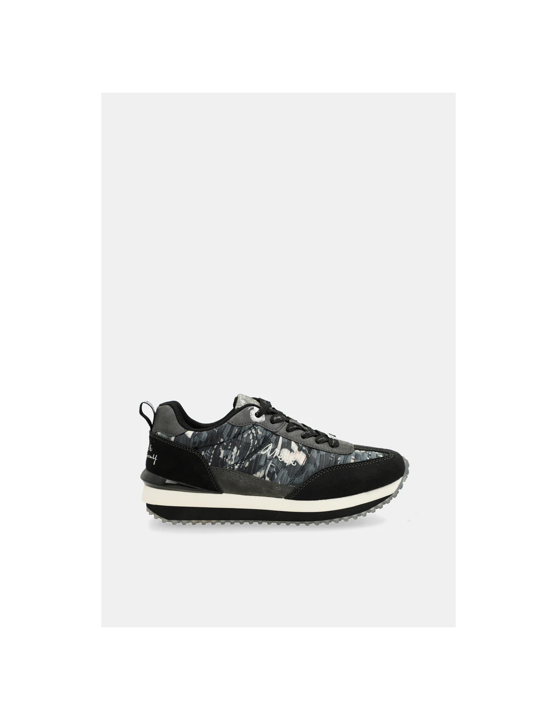 Su diseño combina una base negra combinada e infinidad de detalles. La suela multicolor, muy original y en forma dentada garantiza comodidad a cada paso, con la puntera un poco elevada para facilitar el paso y cordones ajustables para mejor calce.