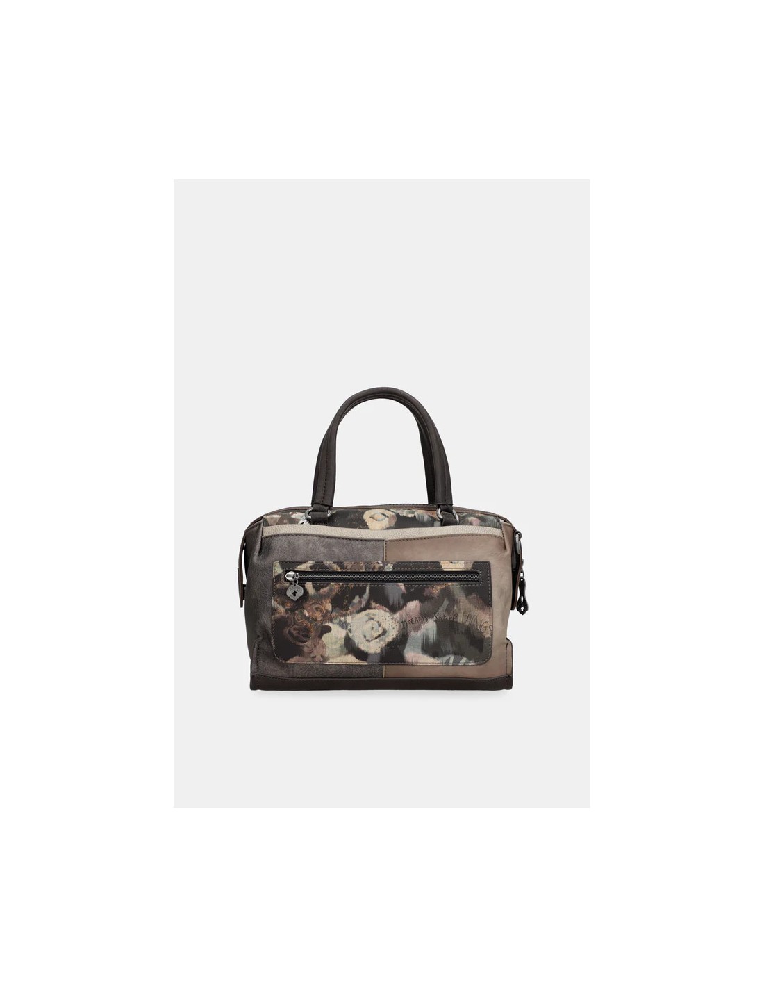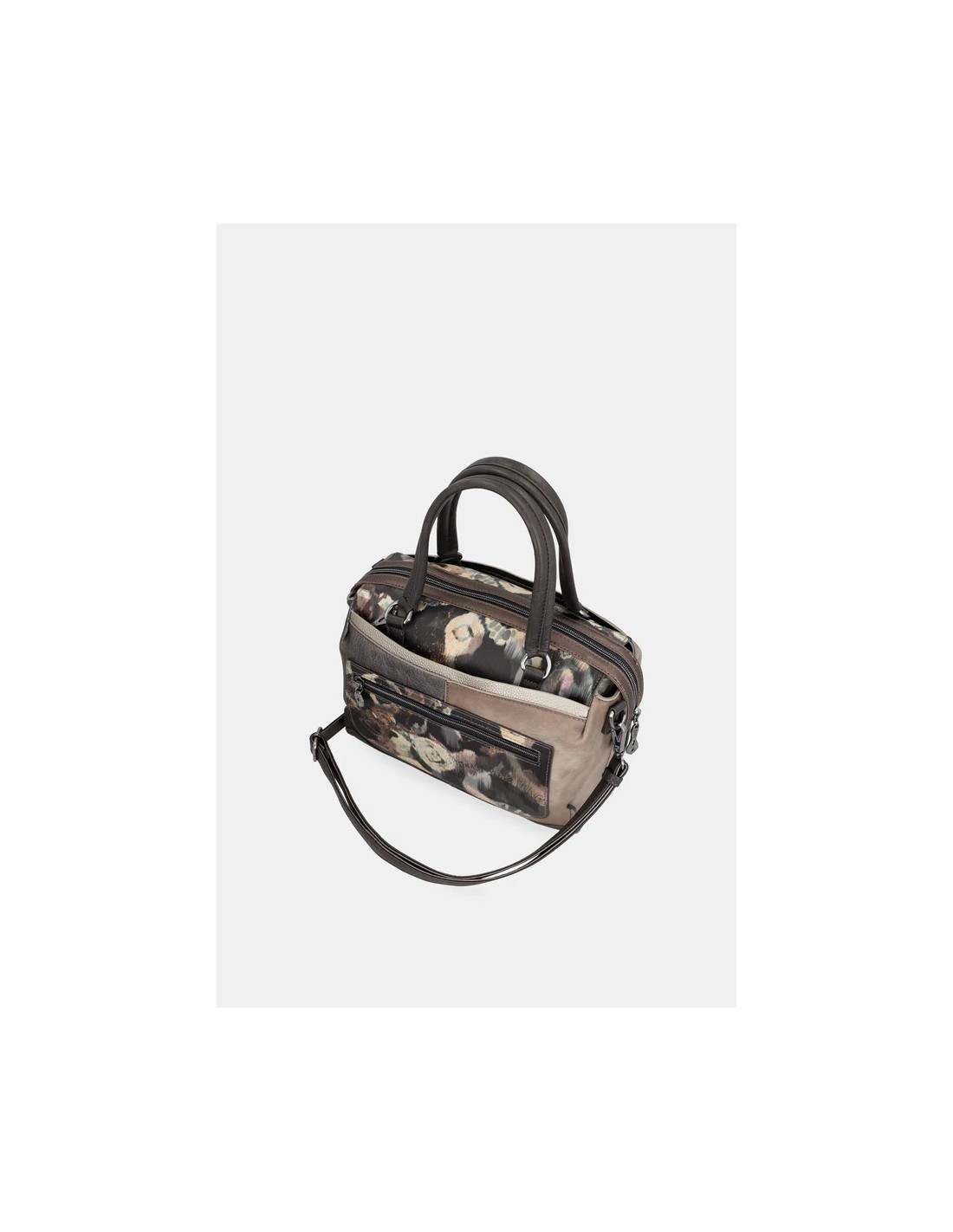 Diseñado en un tamaño mediano y con con  compartimentos con cierre de cremallera en la parte trasera y otro en la delantera. Su bolsillo principal,,  con cierre de cremallera y su interior forrado con un original tejido estampado con motivos de la colección y cuenta con varios compartimentos.  Con dos asas de mano y además un asa bandolera regulable extraíble para ajustar a la altura que  se desee.