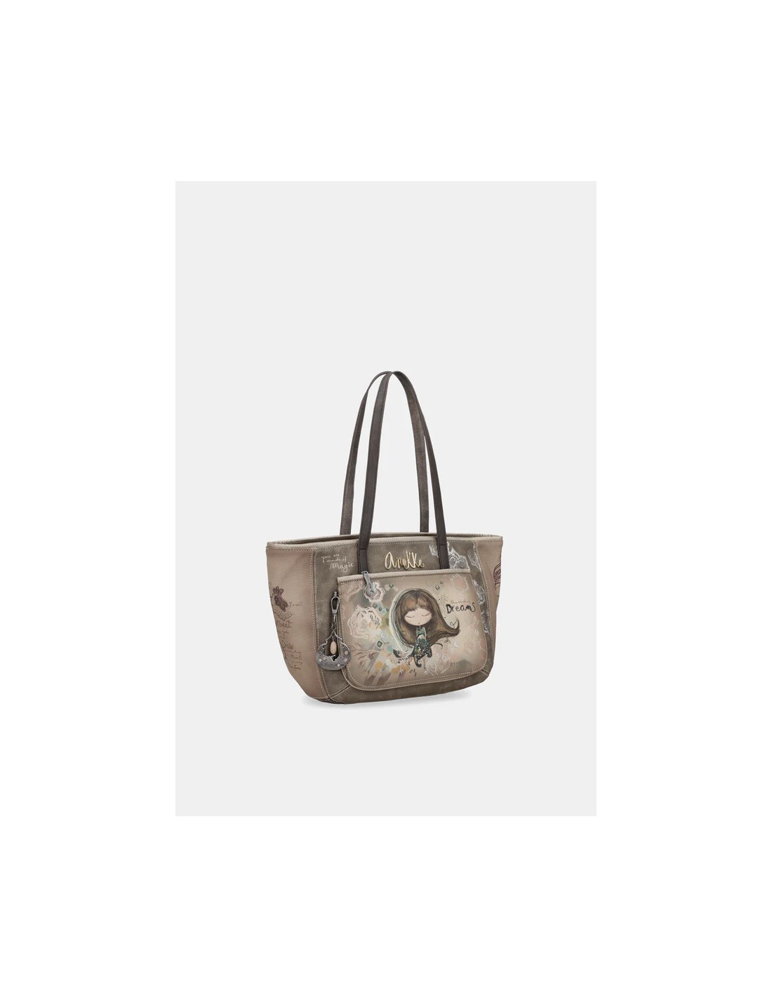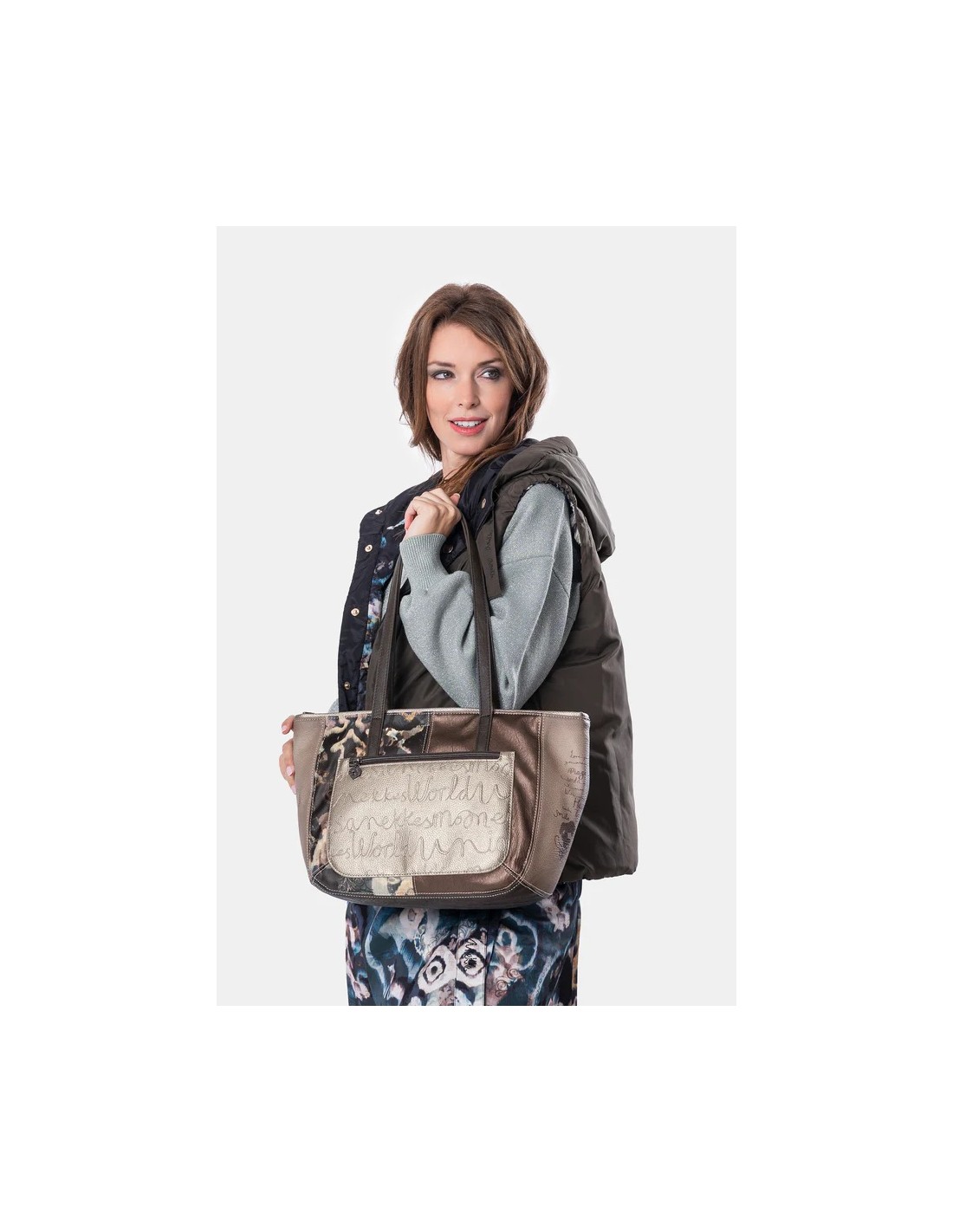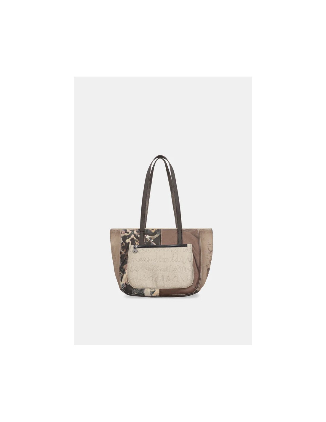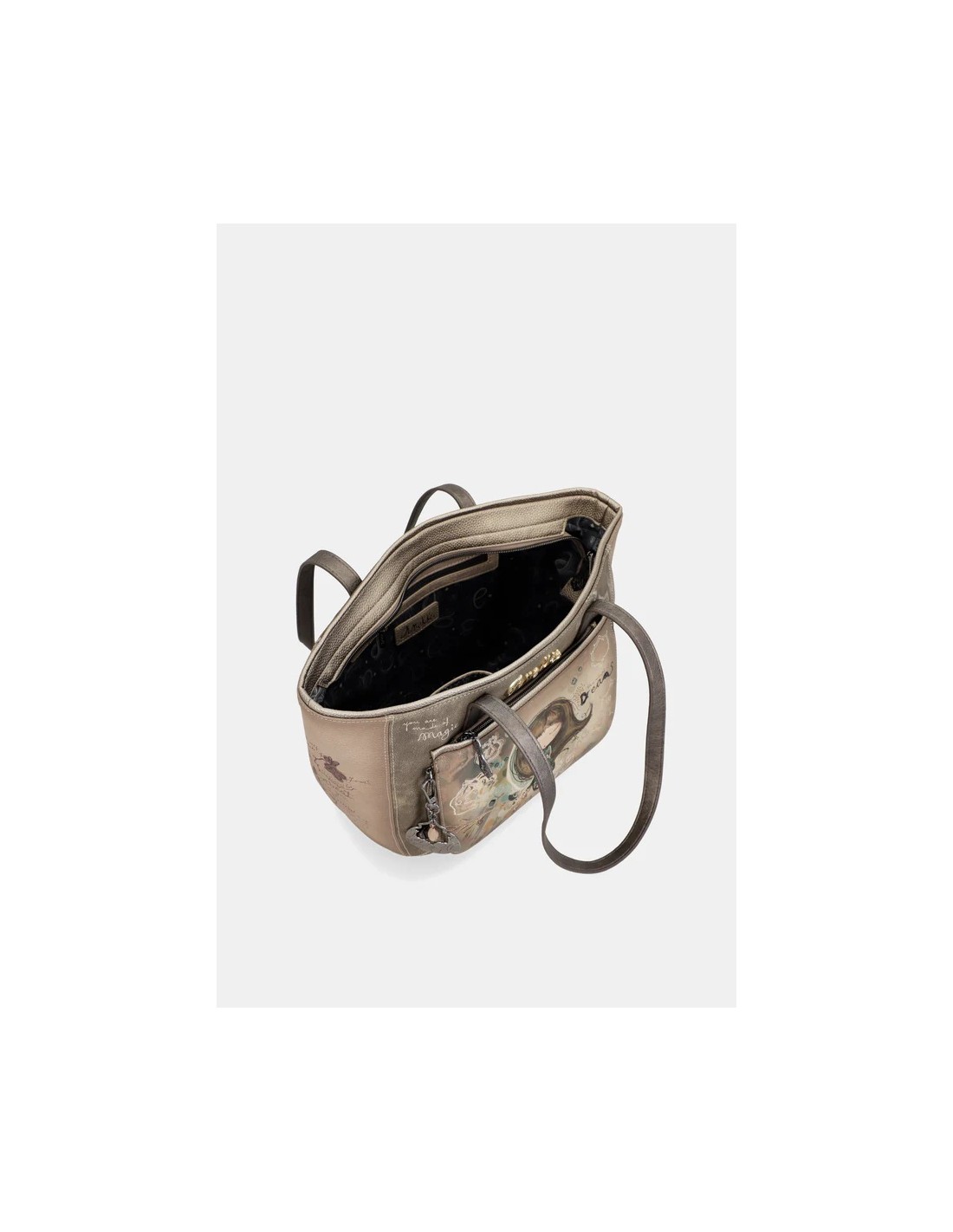 Diseñado con un tamaño grande. Cuenta con un amplio compartimento en la parte frontal y  otro en la trasera, ambos con cierre de cremallera. Su bolsillo principal, con cierre de cremallera y su interior forrado con un original tejido estampado con motivos de la colección y cuenta con varios compartimentos. De dos asas amplias pata colgar cómodamente sobre el hombro.