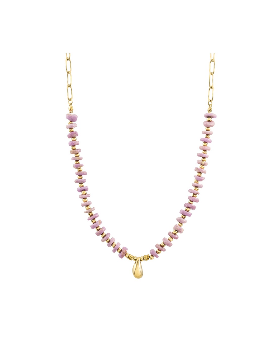Original collar diseñado en cadena dorada con pequeños eslabones  y con piedrás ágata en color y con un pequeño colgante en forma de gota dorado de la colección GINARA de la firma MOMENTS.