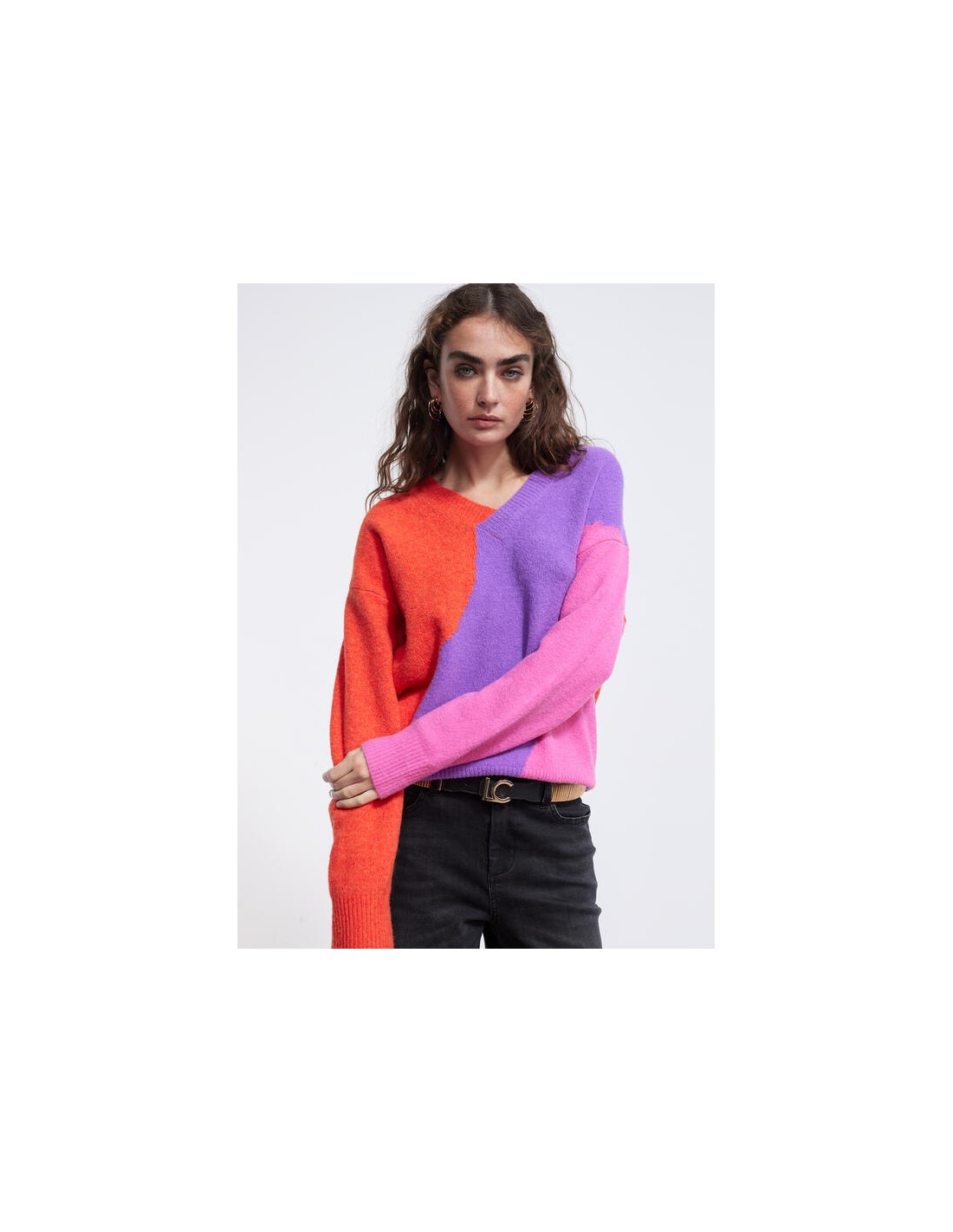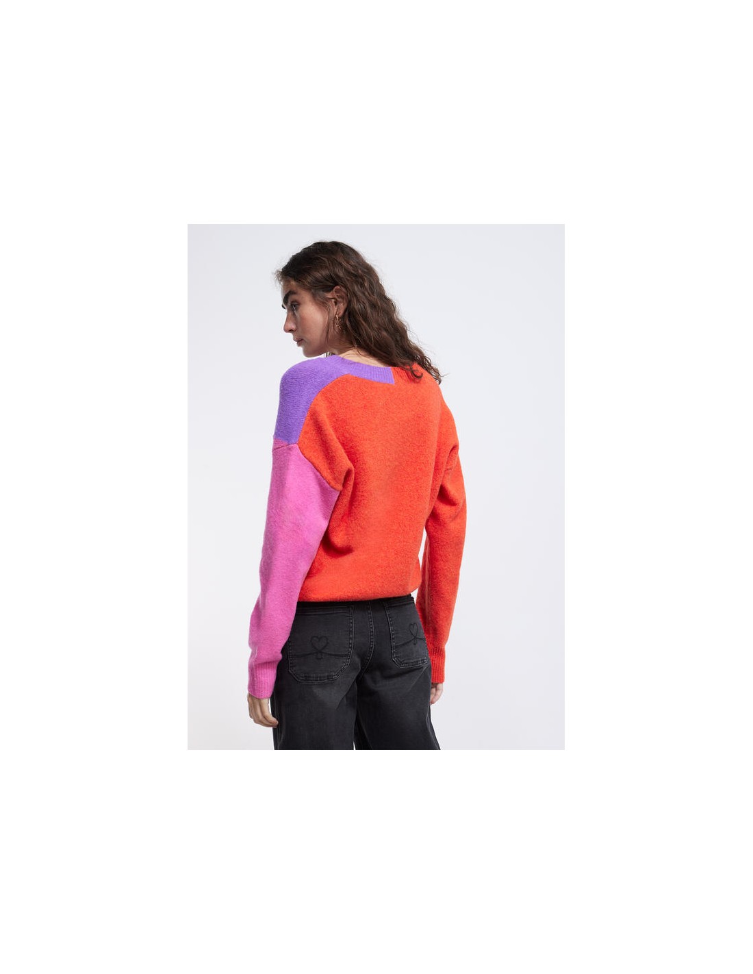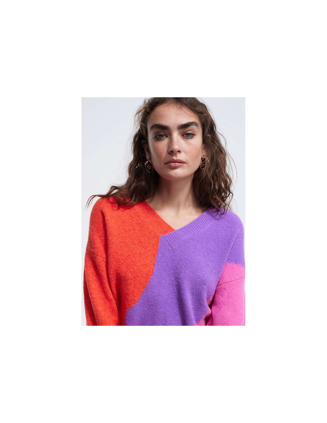Precioso jersey de punto con una original combinación de colores, naranja, lila y rosa, con cuello de pico y canalé en puñps y bajo, de la nueva colección de Invierno de la firmaLOLA CASADEMUNT.
