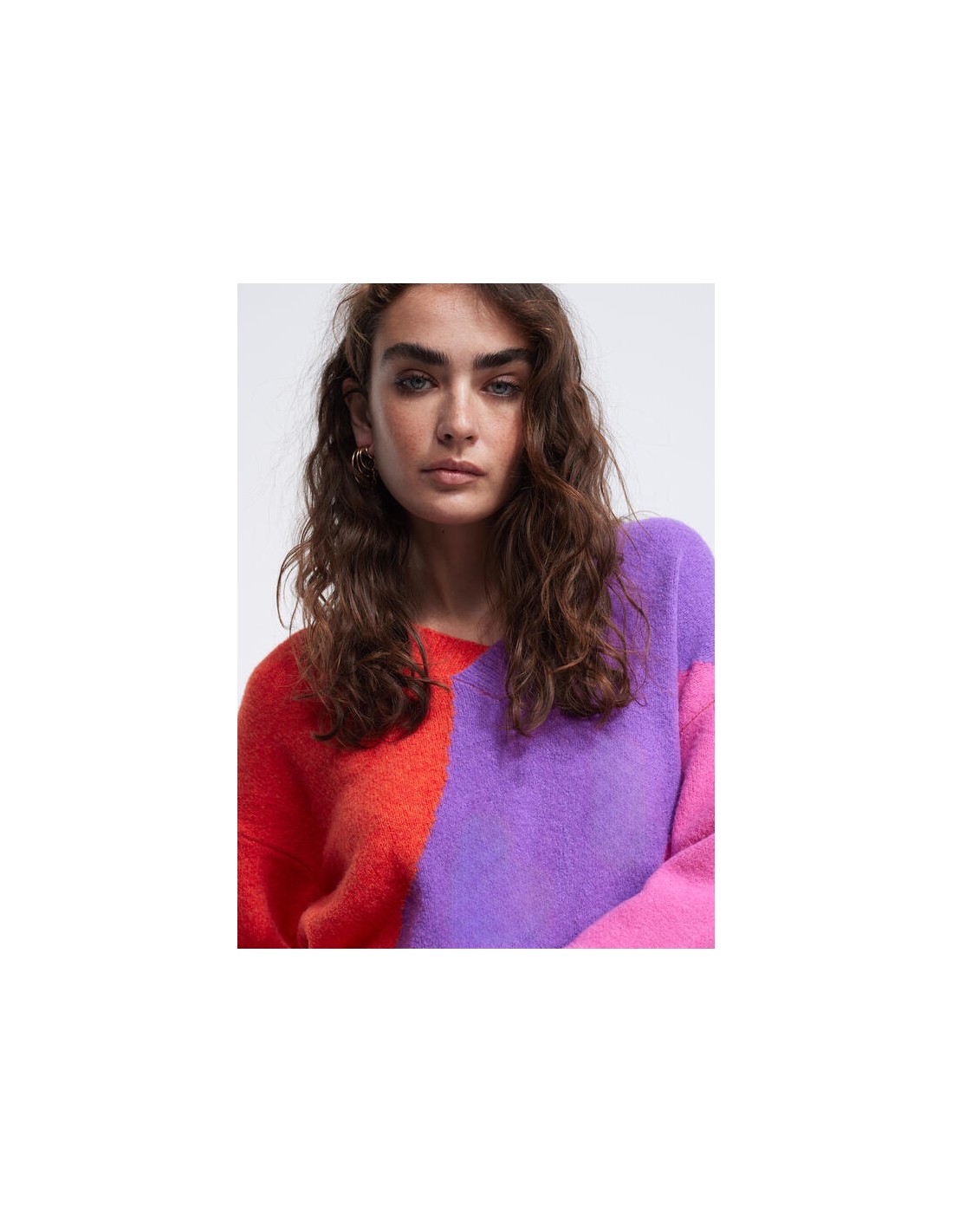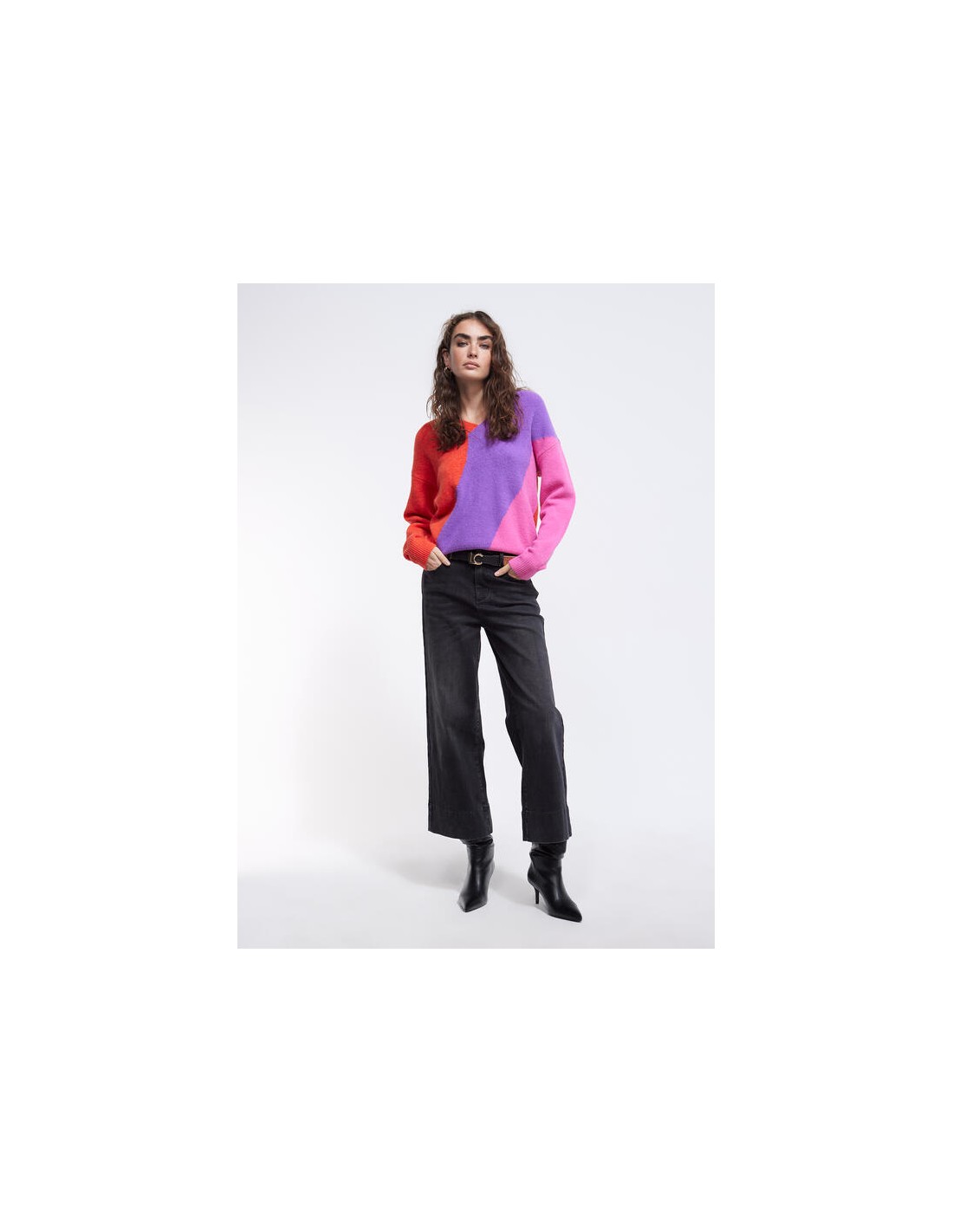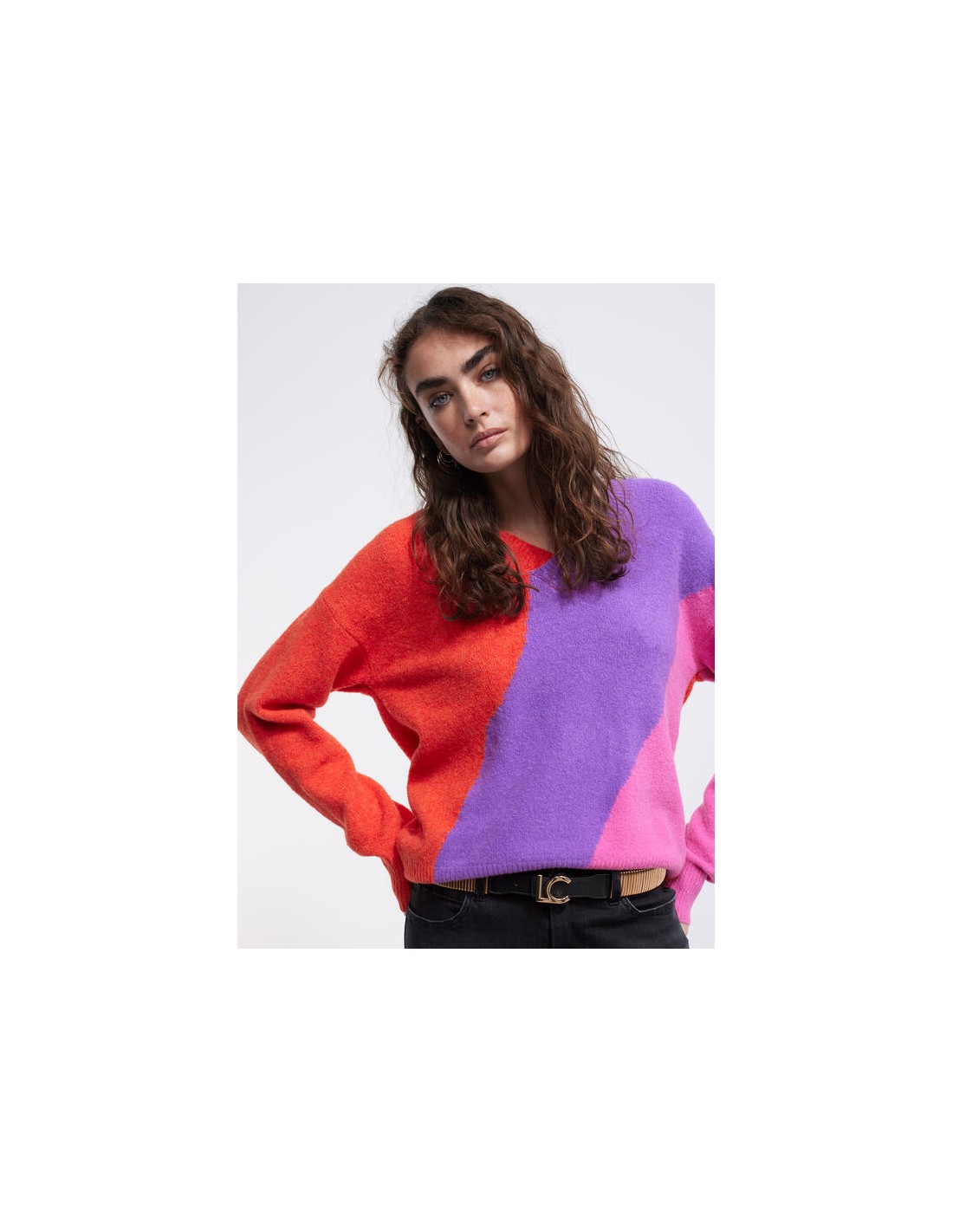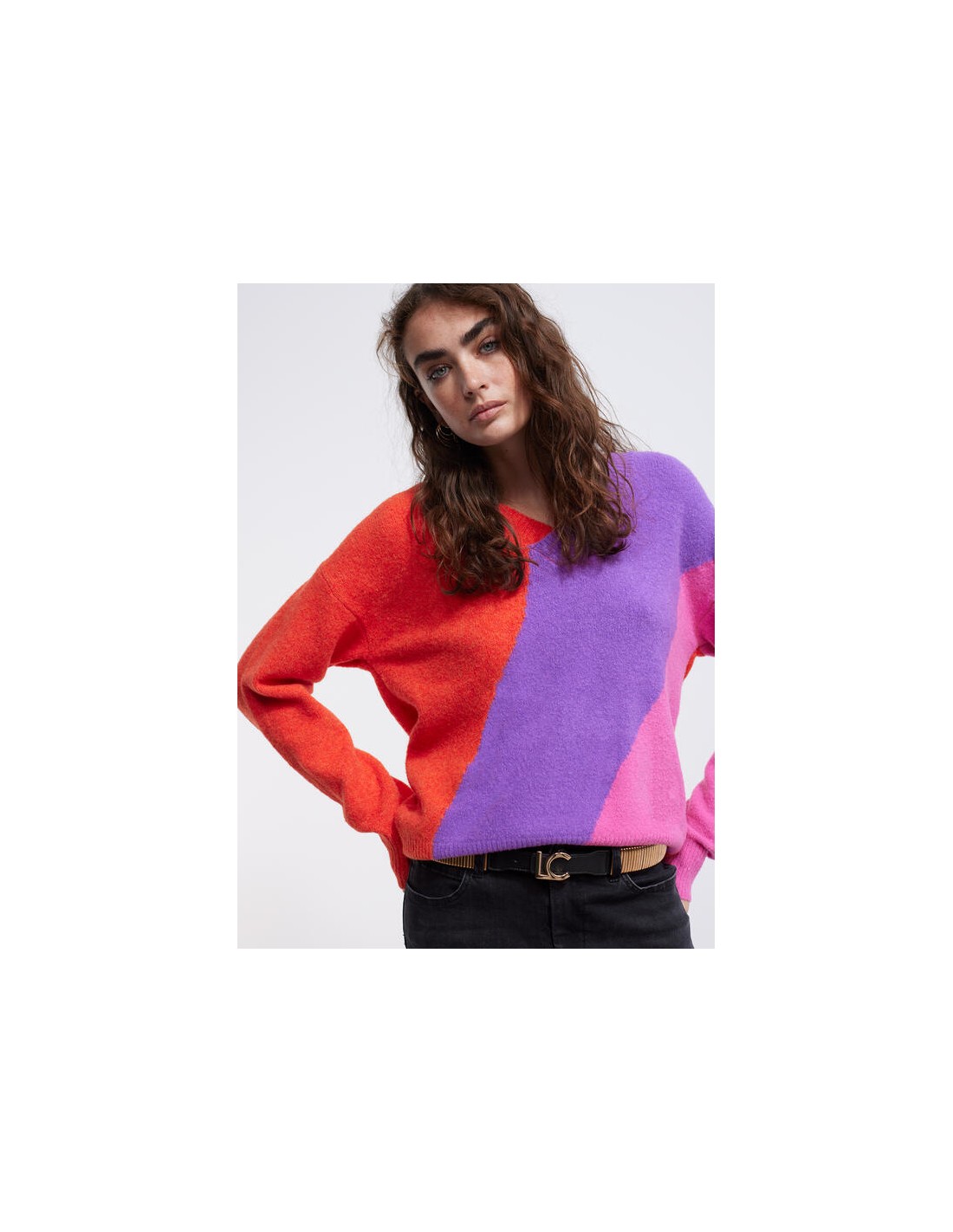 Precioso jersey de punto con una original combinación de colores, naranja, lila y rosa, con cuello de pico y canalé en puñps y bajo, de la nueva colección de Invierno de la firmaLOLA CASADEMUNT.