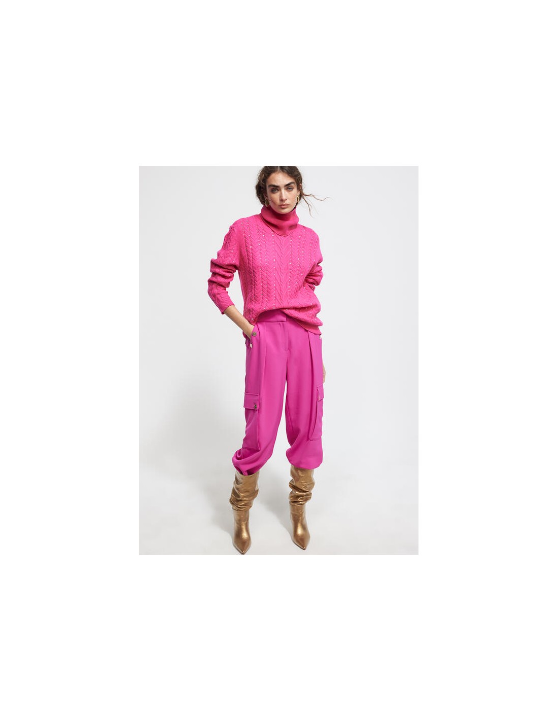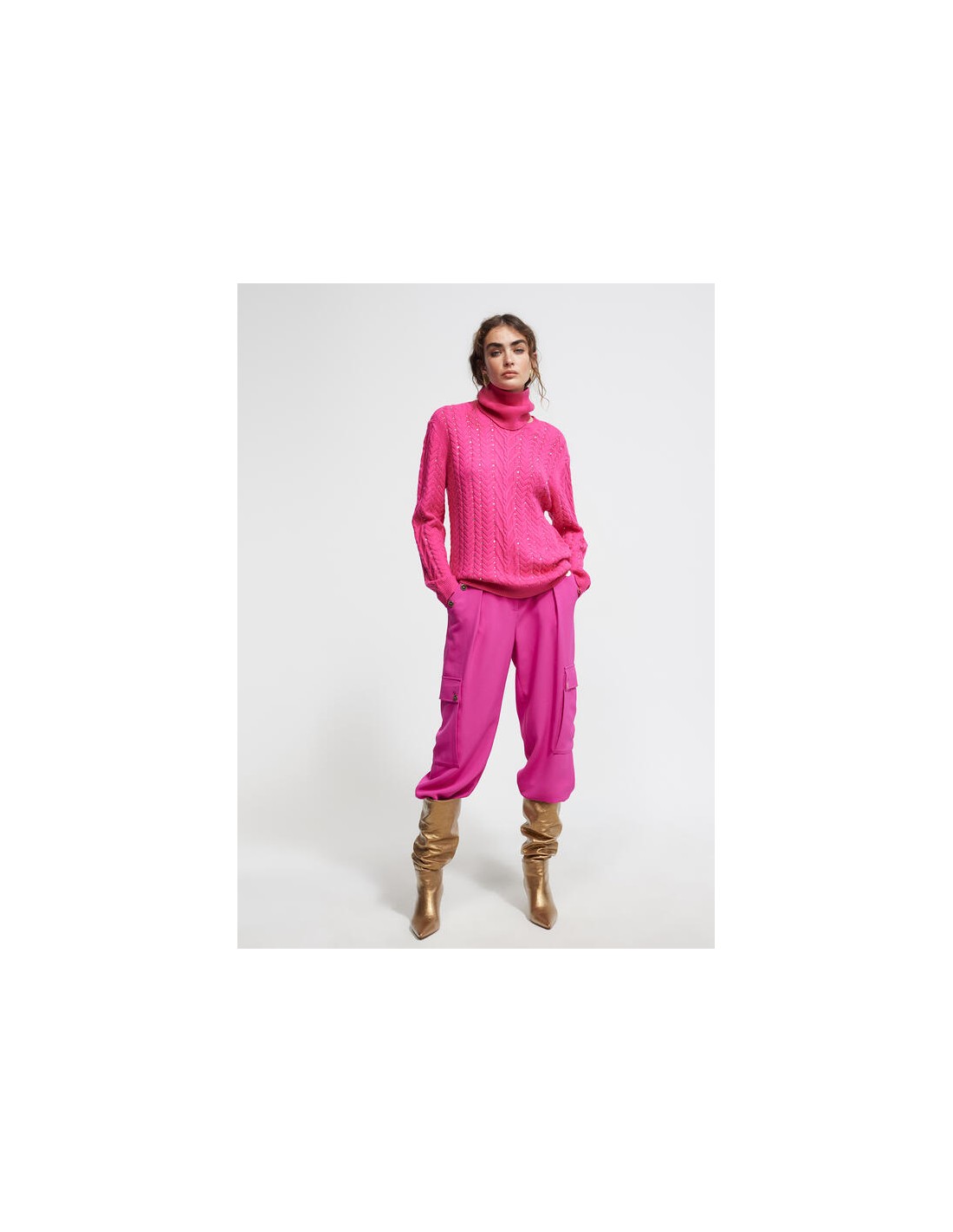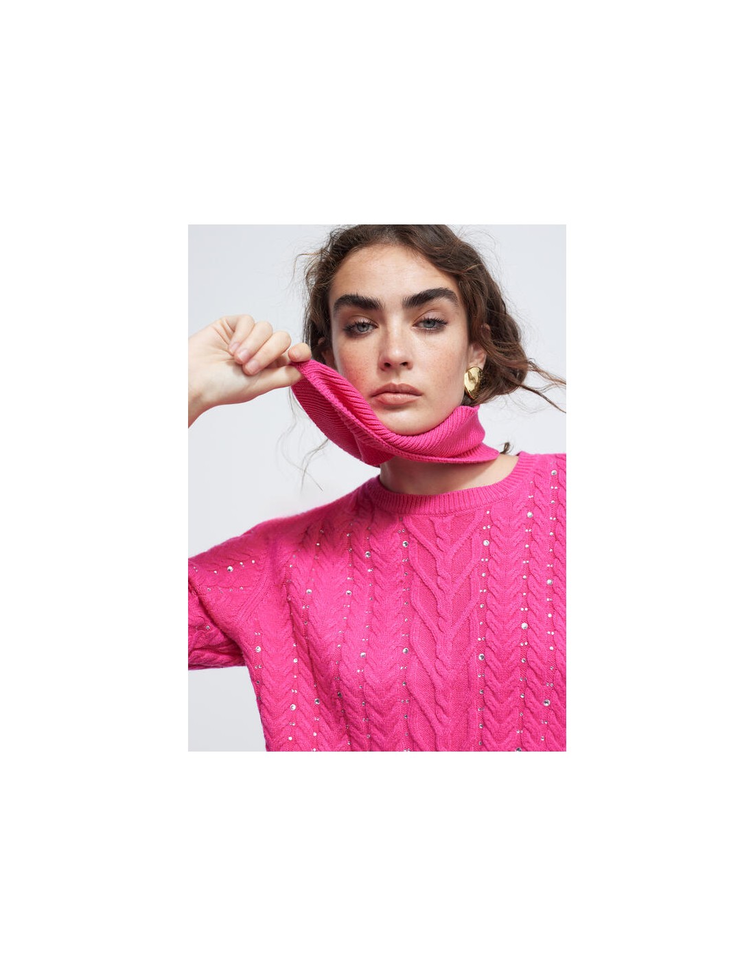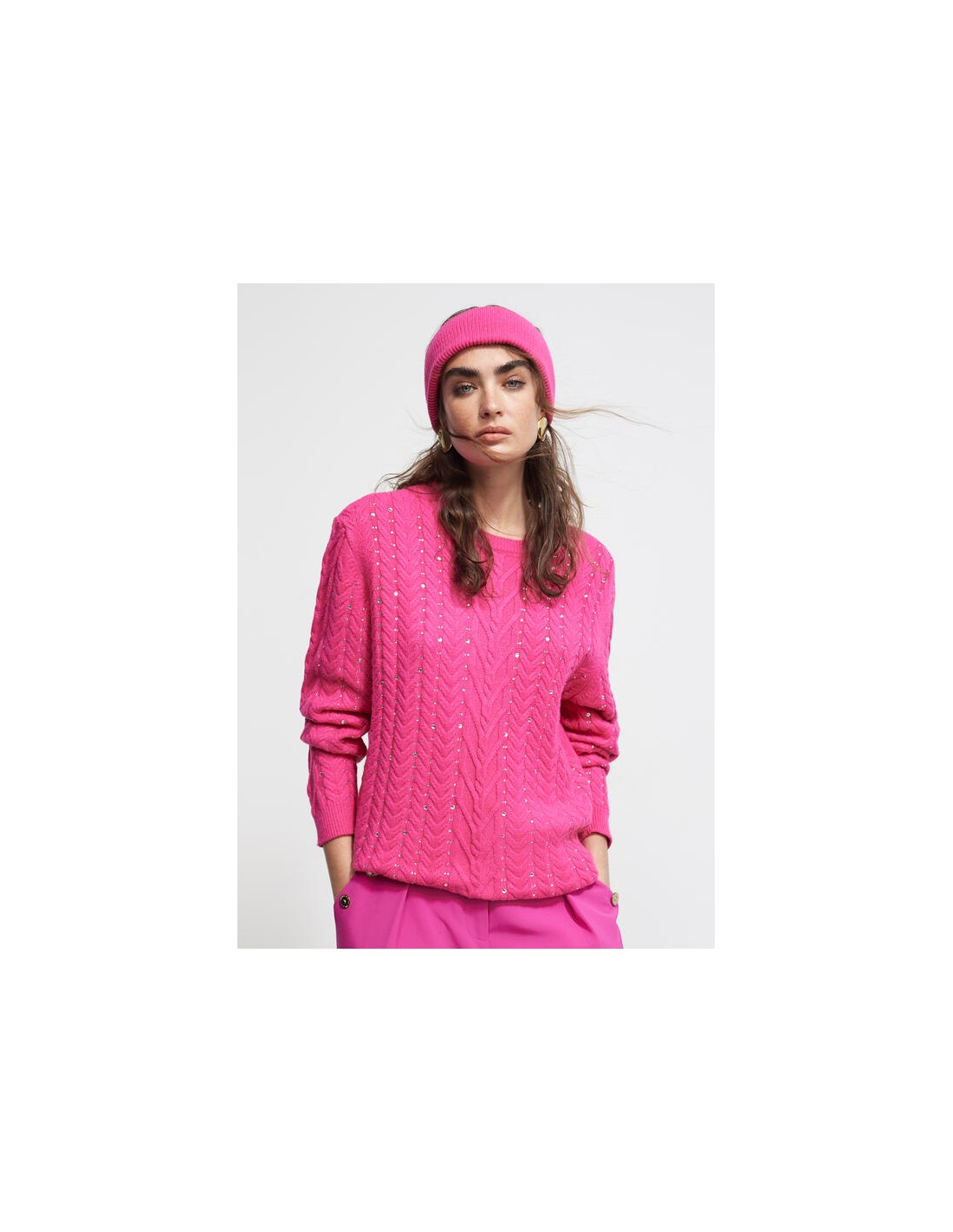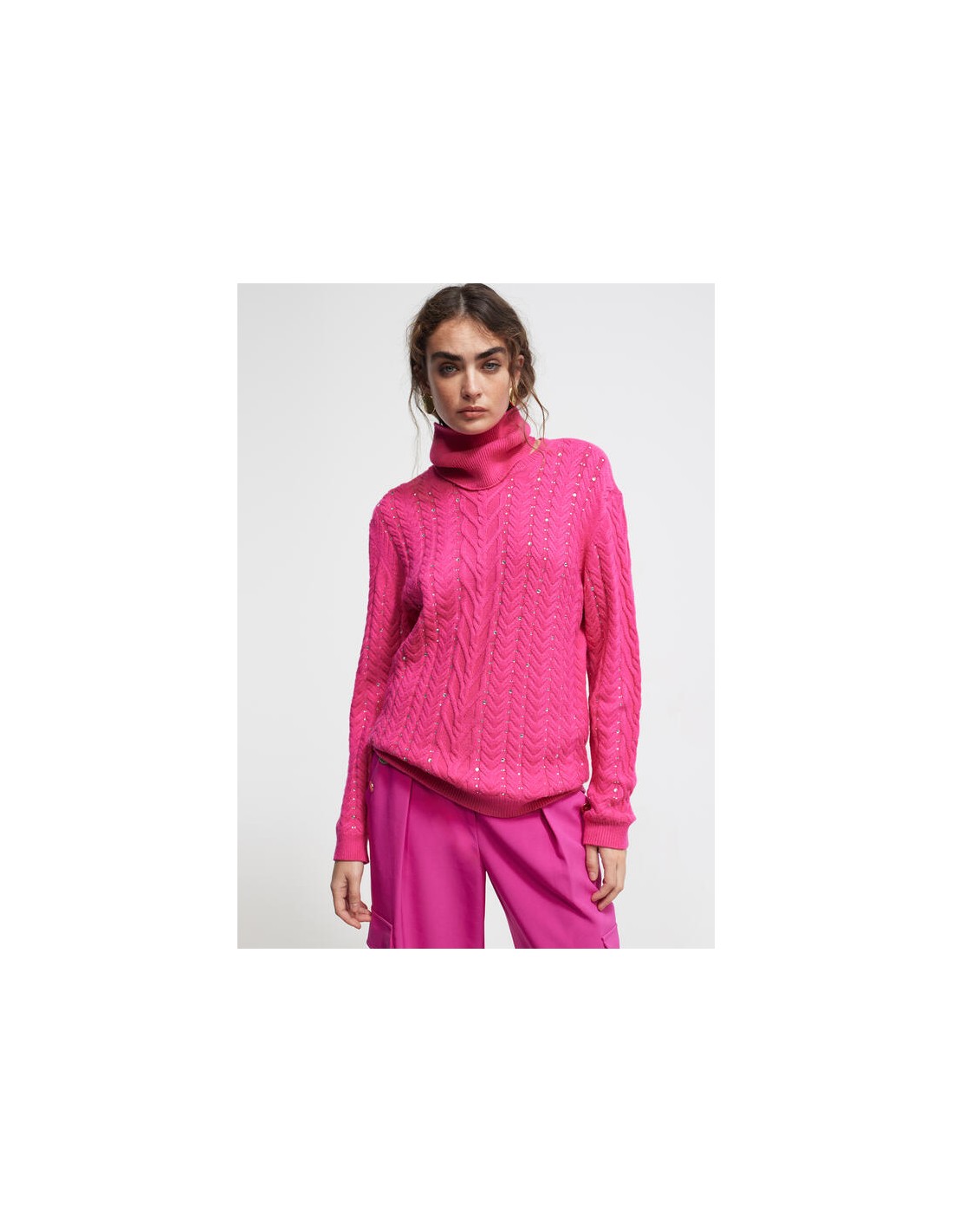 Precioso jersey color fucsia con originales detalles. Diseñado en punto y cuello alto que pueder darle el uso que prefierad. Con un bonito trenzado en la parte frontalcombinado con strass a contraste. Puños y bajo en canalé. Dela nueva colección de Invierno de LOLA CASADEMUNT.
