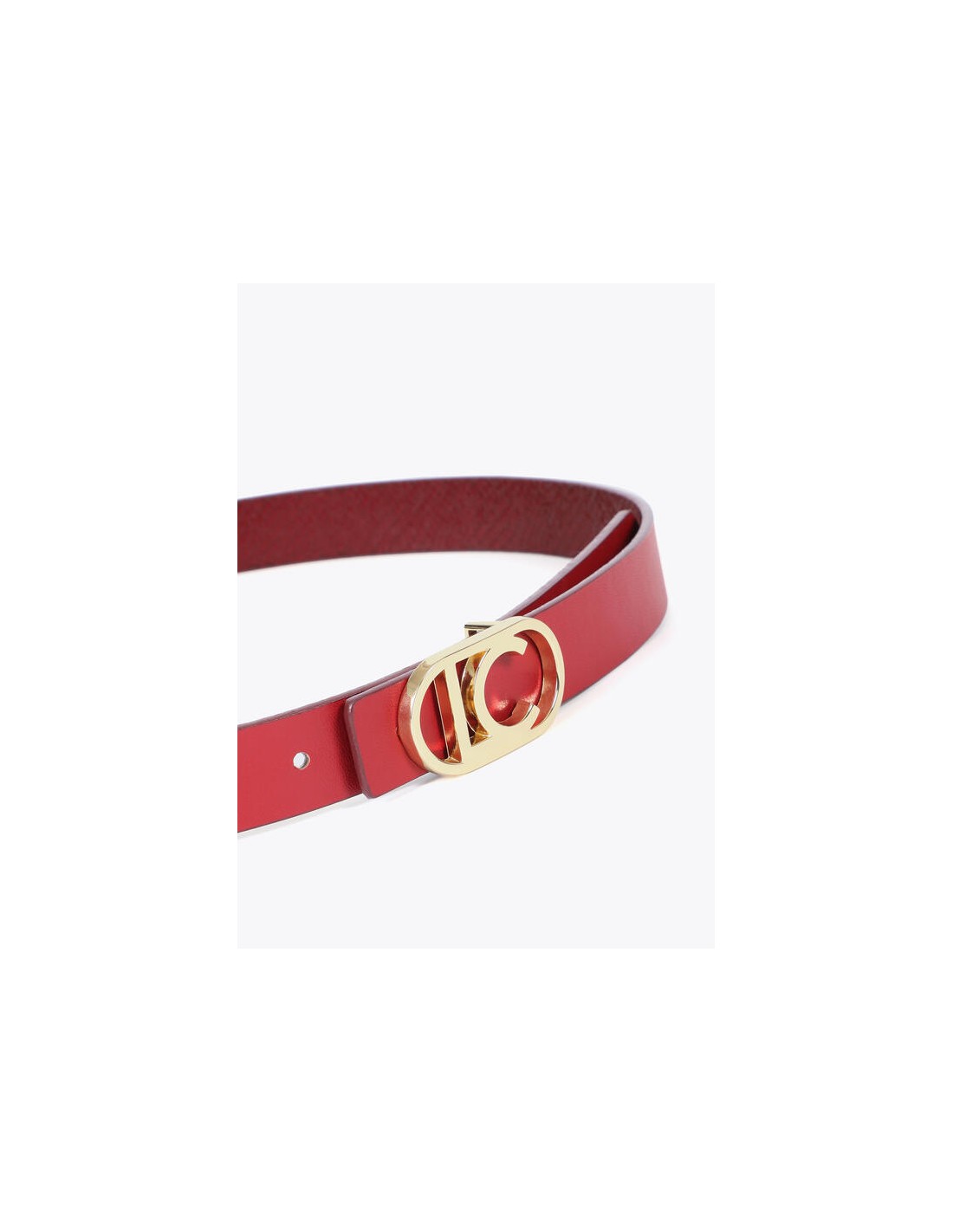 Con un diseño reversible por un lado en textura piel de serpiente grante y por el otro rojo en efecto piel. Con original hebilla con logo dorado ovalado-