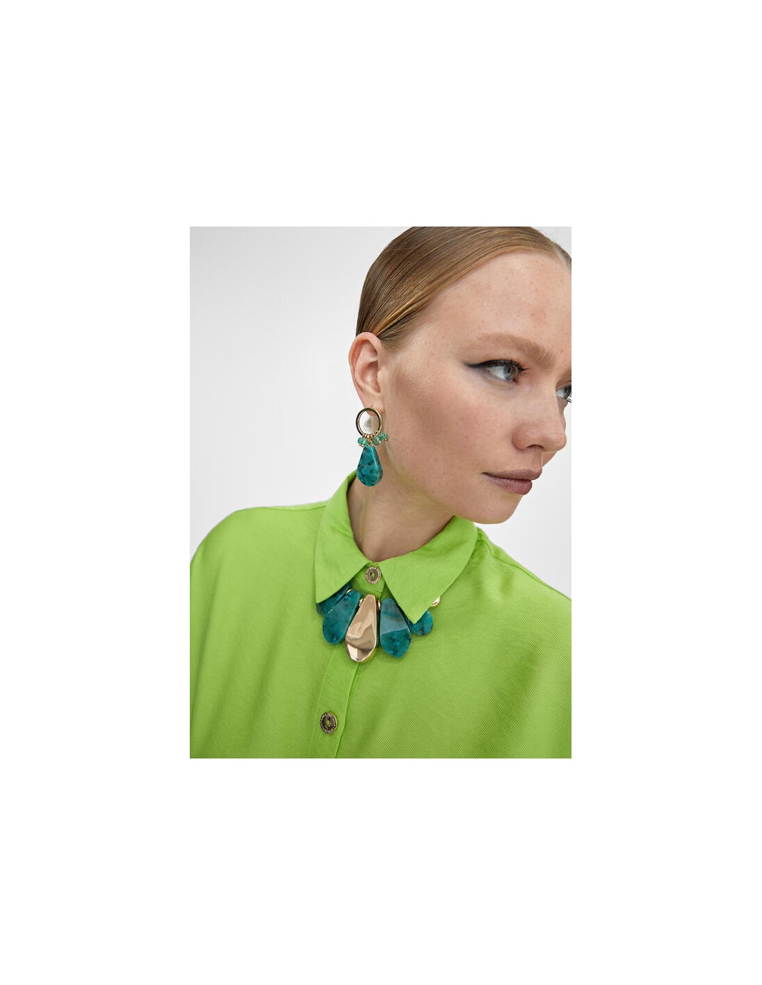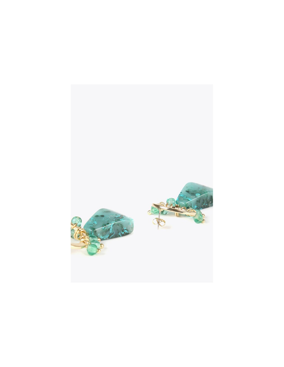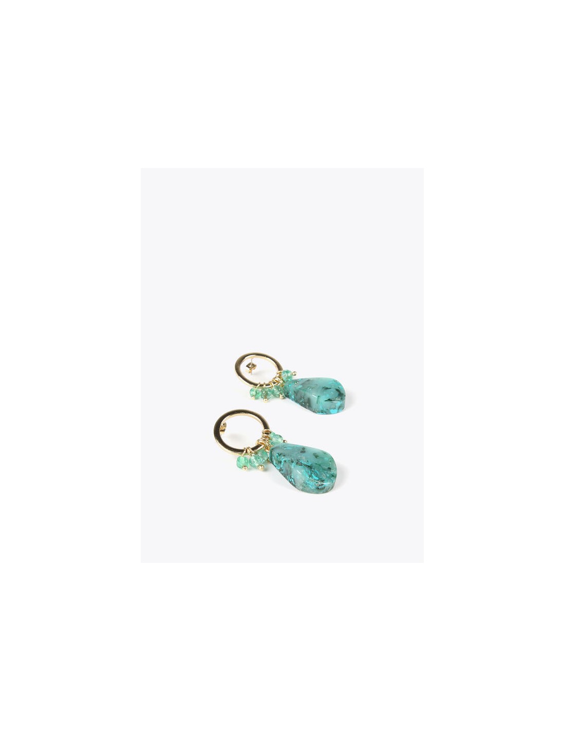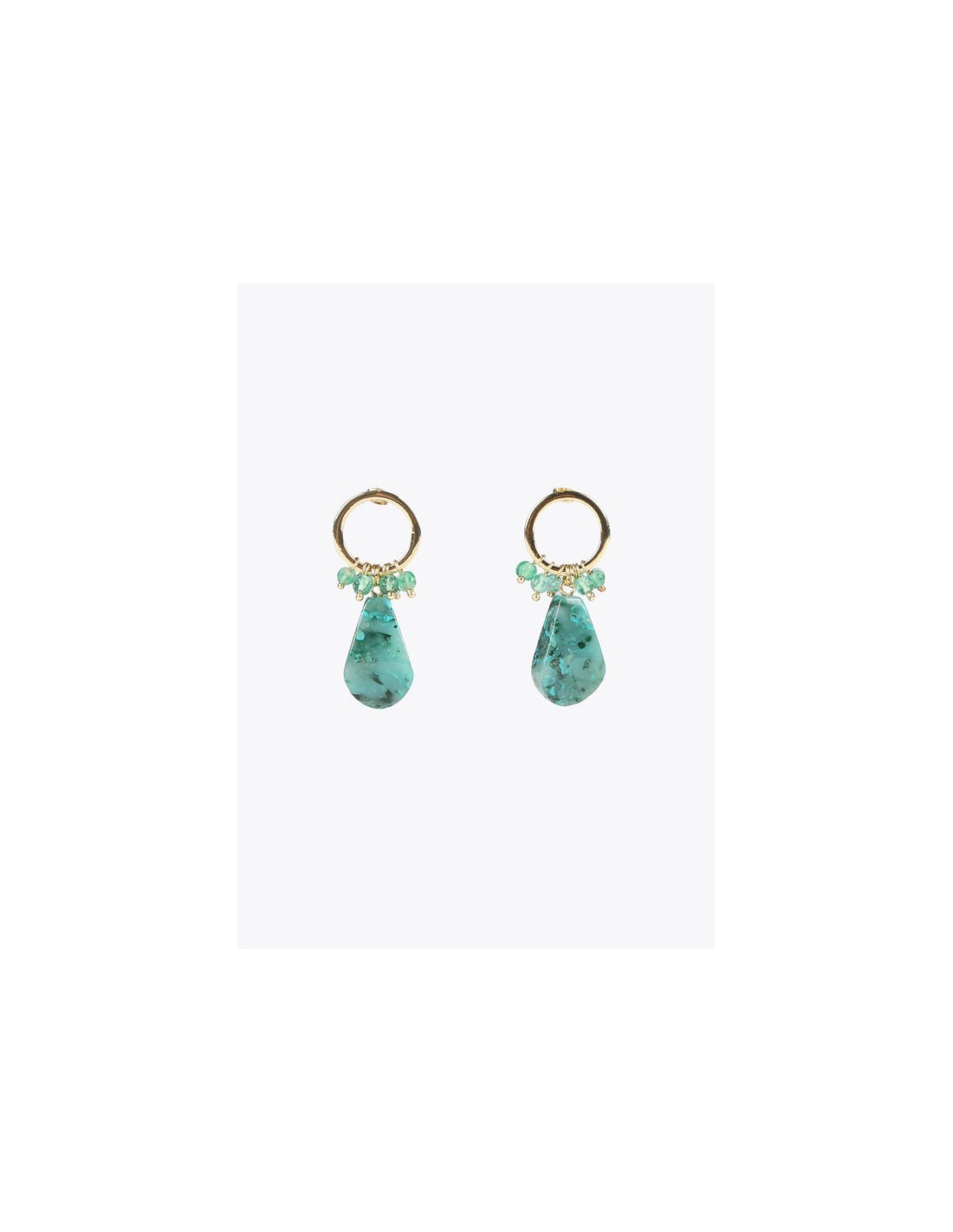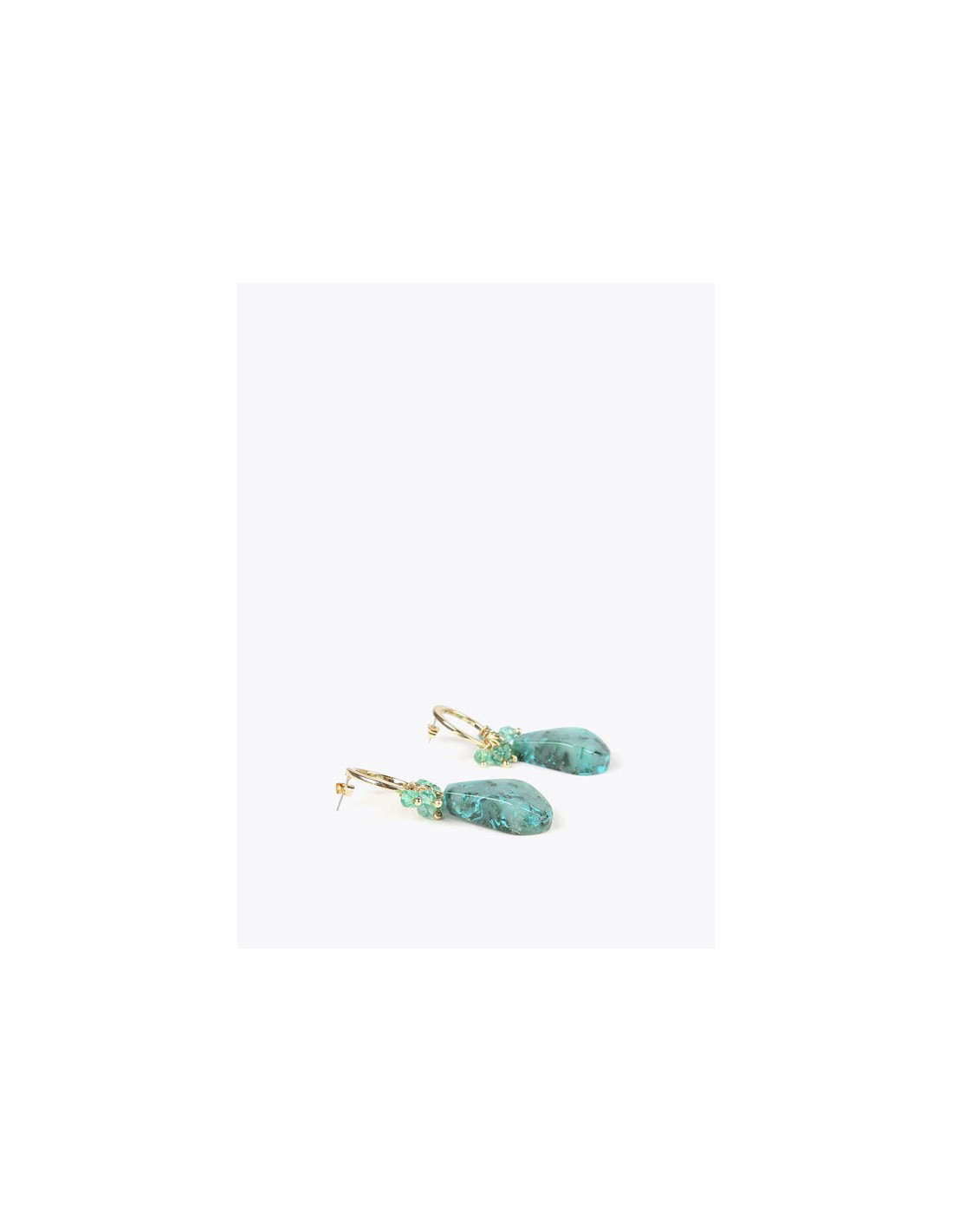Preciosos pendientes con colgante de piedra en turquesa y pequeñas bolitas en el mismo color, con aplqiue aro en dorado en el cierre, el cual es a presión de la nueva colección de la firma LOLA CASADEMUNT.