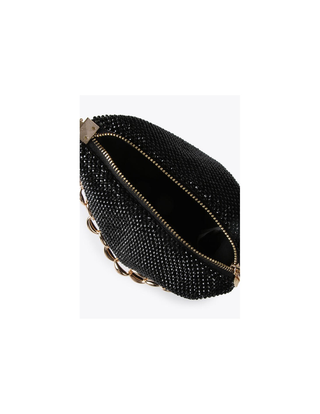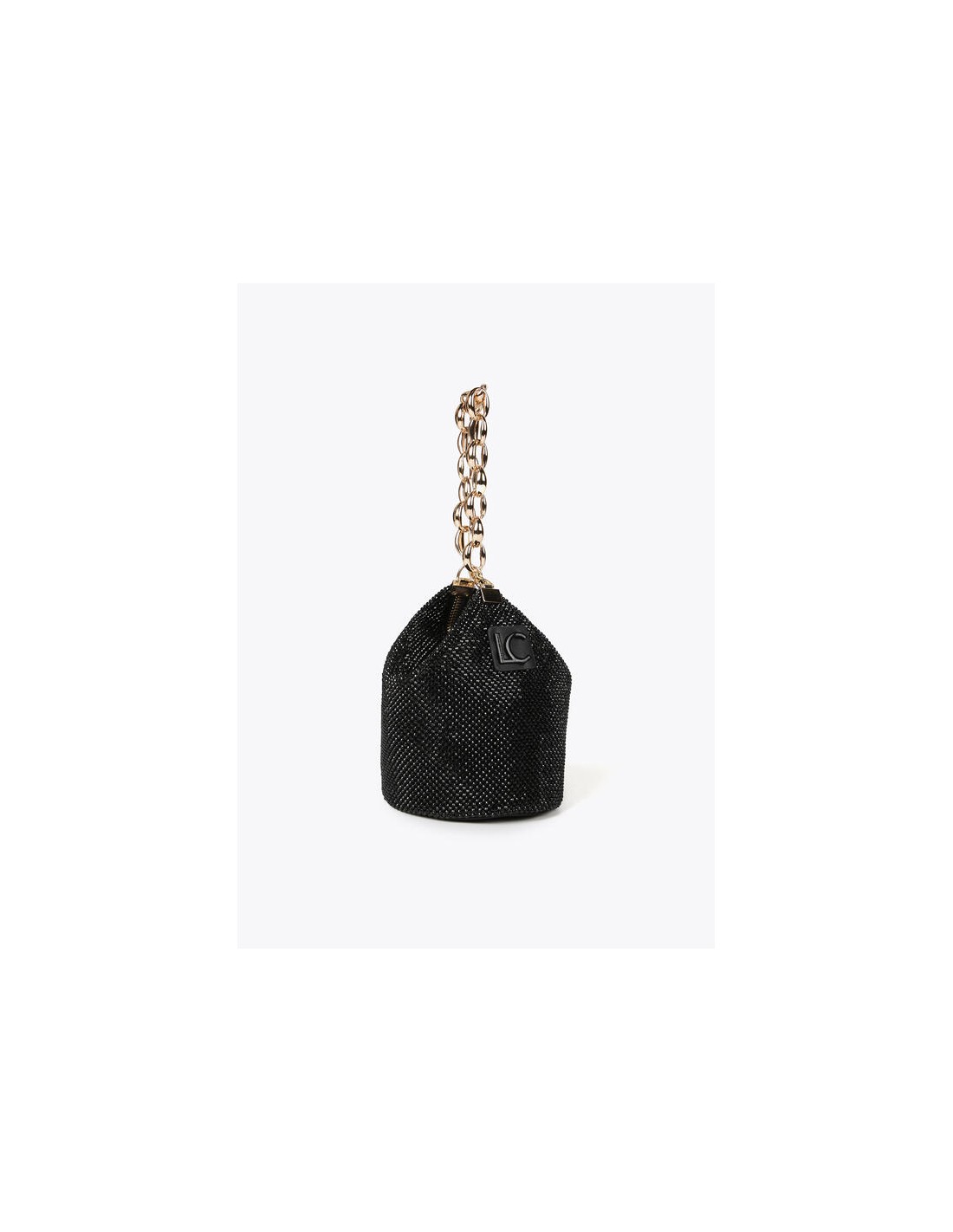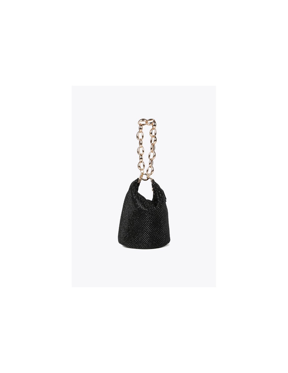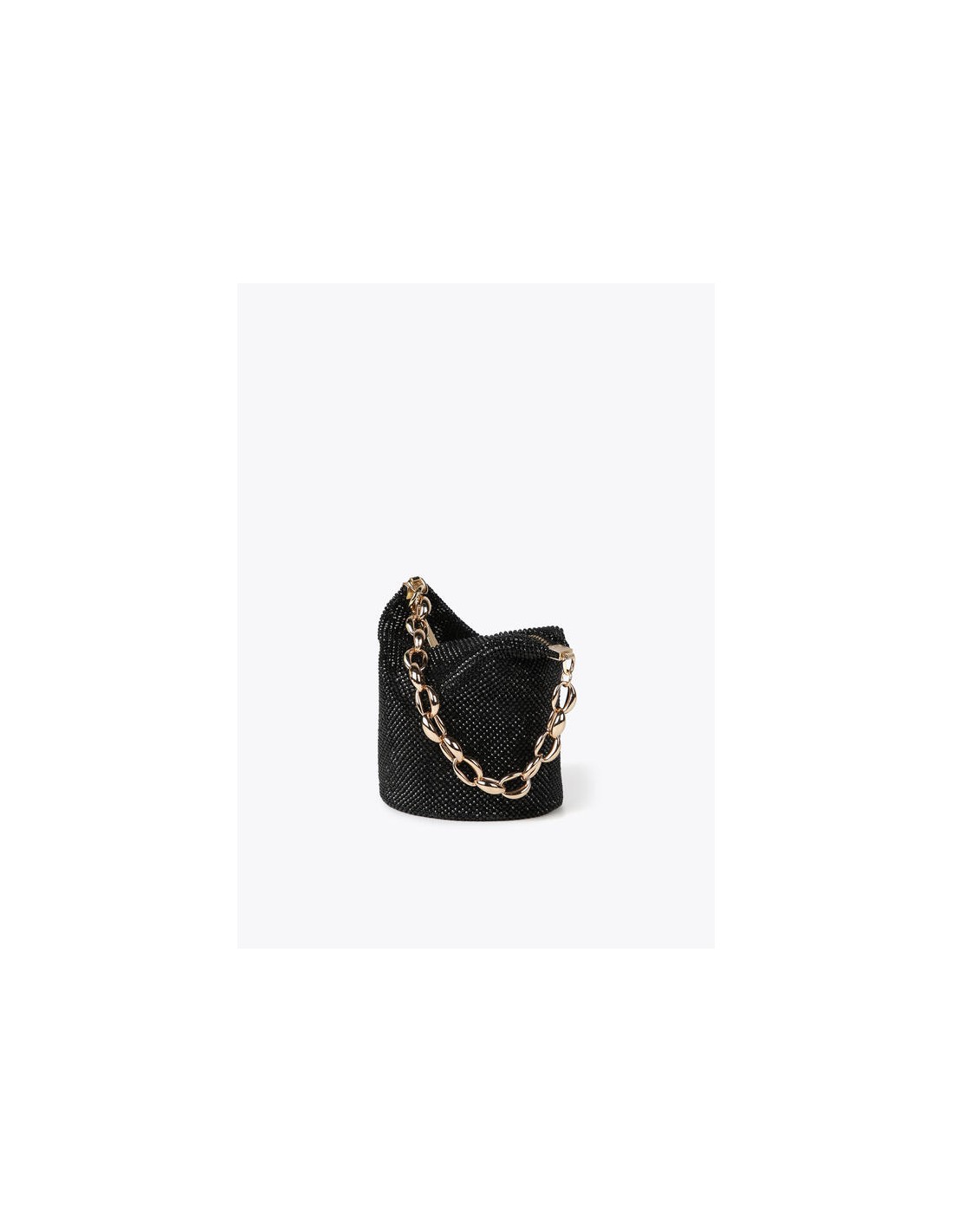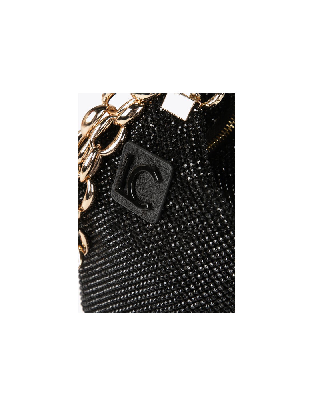 Diseñado en rejilla y en pequeños cristales en negro. Su bolsillo principal es con cierre de cremallera y su interior está forrado en textil con un pequeño compartimento en un lateral. Se compone de una asa de cadena dorada con eslabones. Con logo en metal al tono en la parte frontal.