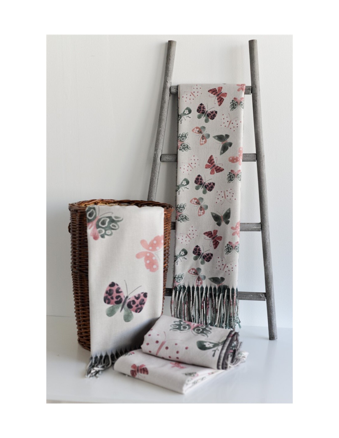 Con un tacto muy suave y agradable. Perfecto para esta temporada en los días de más frio. Con detalle de flecos. Los colores de la parte lisa de un color son, beige, marrón, verde  y kaki. Tiene el mismo estampado de mariposas pero cambia el color liso del otro lado.