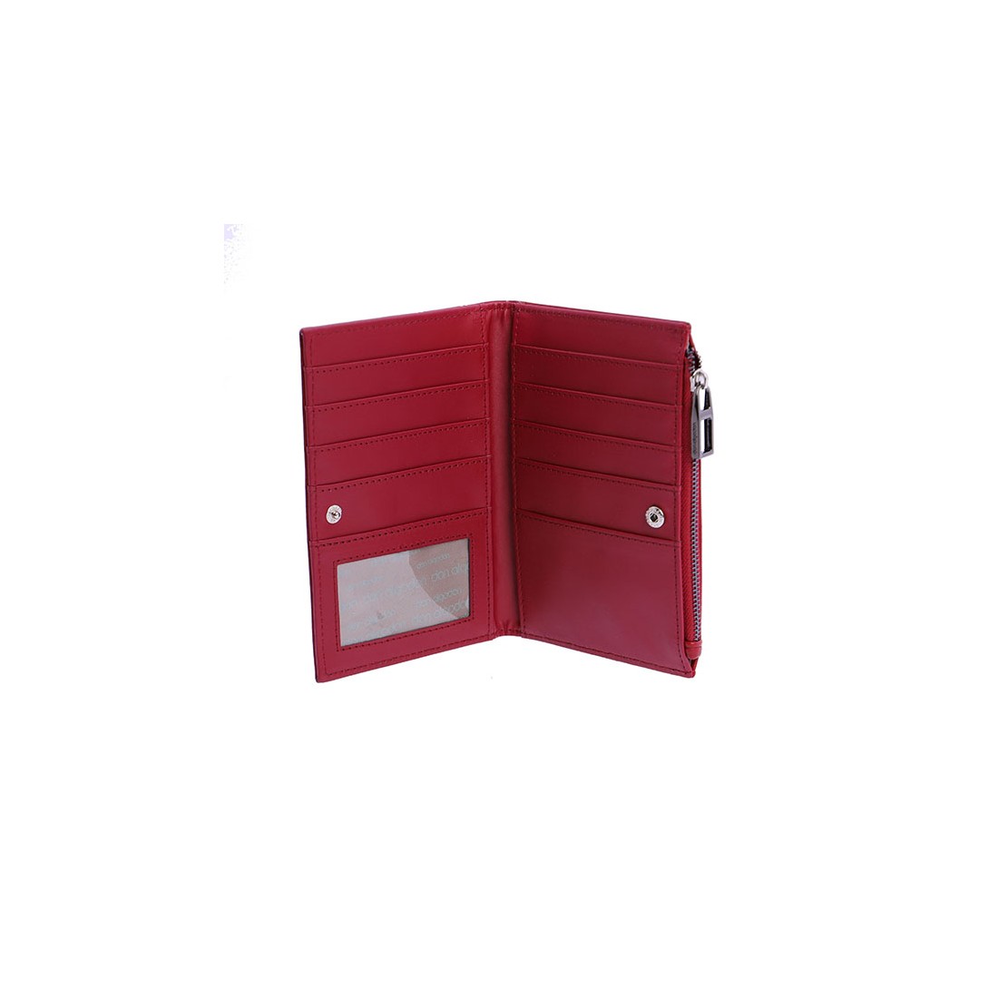 Diseñado en piel sintética de alta calidad. Con dos apartados, uno con cierre a presión , con capacidad hasta nueve tarjetas , un apartado transparente para documentos y compartimento para billetes o papeles. Por otro lado tiene un compartimentos con cierre de cremallera para monedas o lo que quieras ya que es amplio .En la parte inferior de la parte frontal encontramos en nombre de la firma grabado enmarcado entre dos líneas. Un billetero que puedes combinar con el bolso de la misma colección, completo, cómodo y muy llevadero.