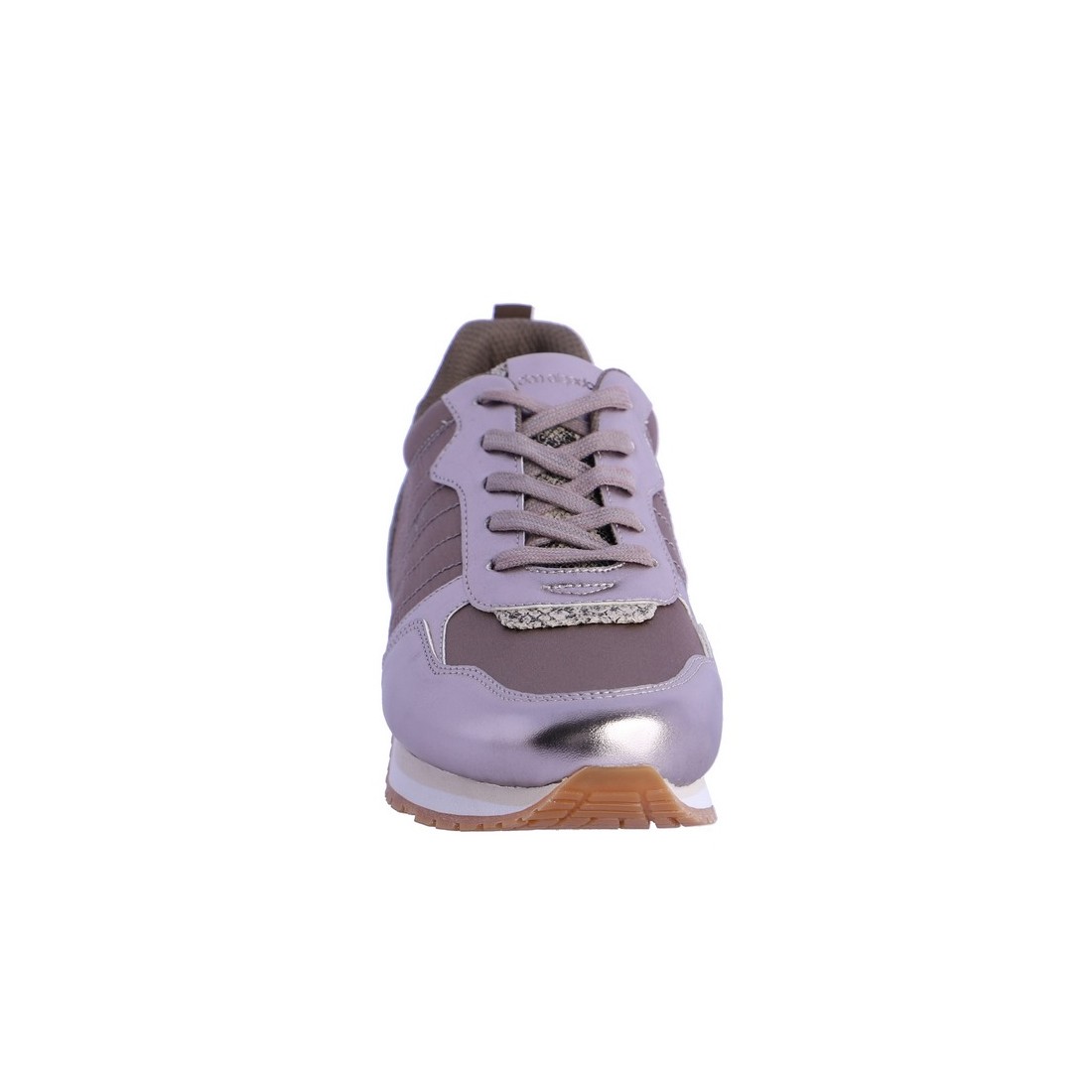 Con un diseño combinado con base en nylon. Puntera Y talón de piel sintética brillante, tipo charol. Con una combinación de colores, plata en distintos tonos. Cordones en gris y plantilla interior acolchada. Nombre de la firma en en talón y una suela engomada antideslizante de 3cm.