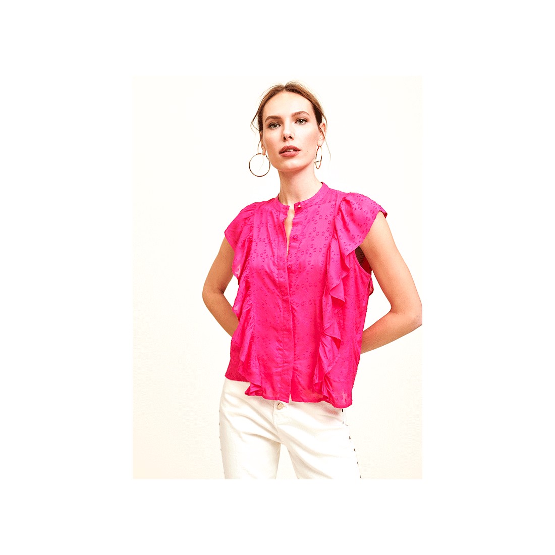 CAMISA VOLANTES LOLA CASADEMUNT. Preciosa camisa sin mangas de la nueva colección PRIMAVERA-VERANO de la firma LOLA CASADEMUNT. Con un diseño sin mangas y el detalle de bonitos volantes que empiezan desde el hombro hasta el final, los lleva delante y detrás, Abotonada , un primer botón visible en dorado y logotipado , los demás tapados Con cuello redondo y unos pequeños bordados al tono por toda la camisa. Una prenda muy fresca, cómoda y de colores muy combinables para este verano.