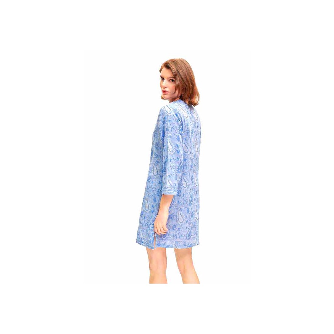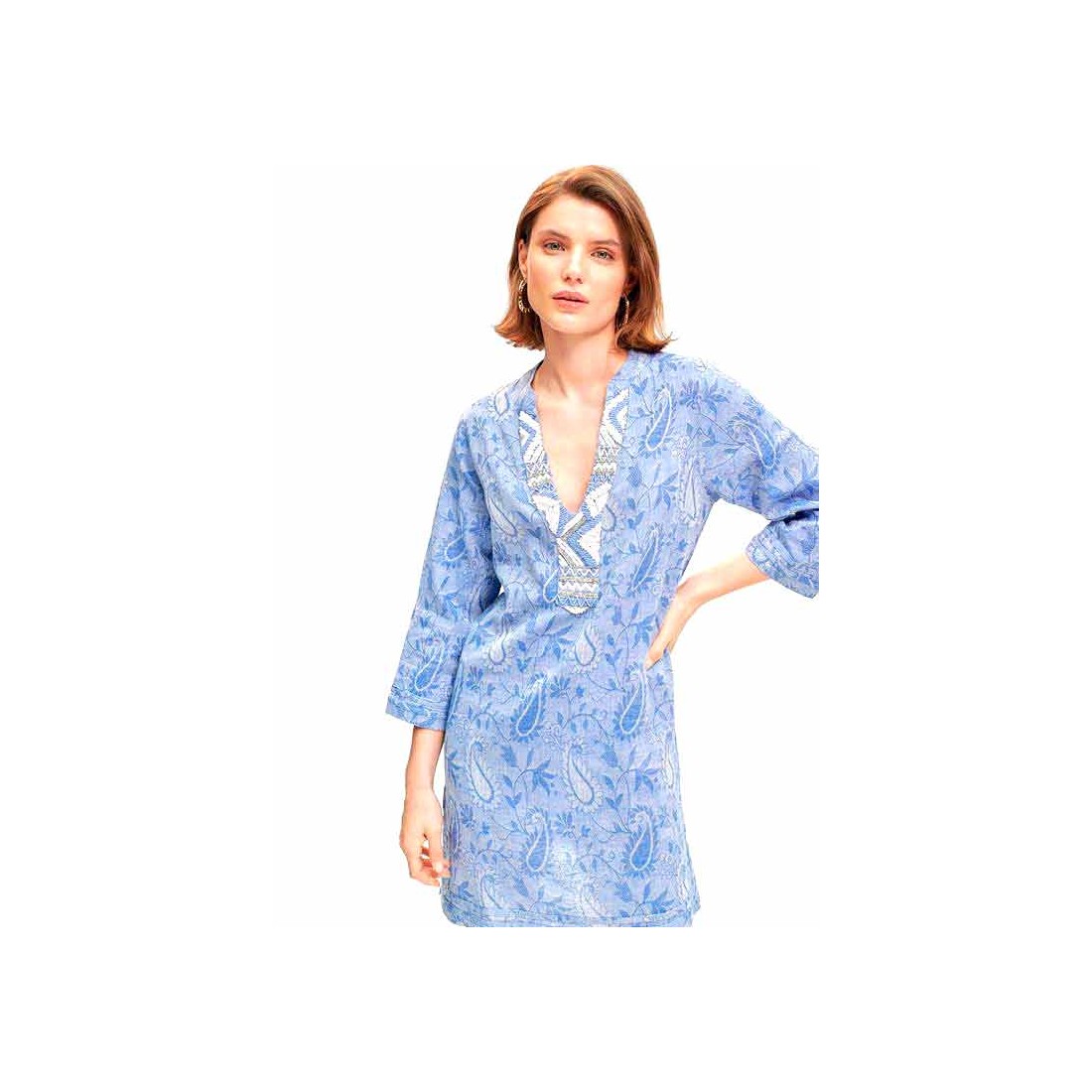 Con un diseño largo, de media manga y cuello mao acabando en pico. Con preciosa pedrería combinada en blanco y azul. Con sencillas aberturas en los laterales. Con un original estampado jacquard al tono.