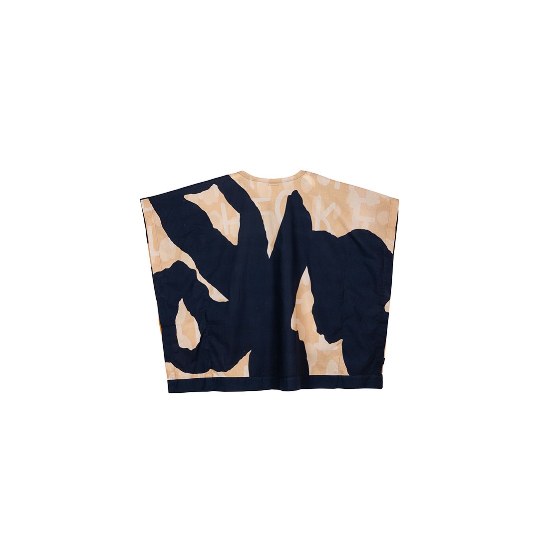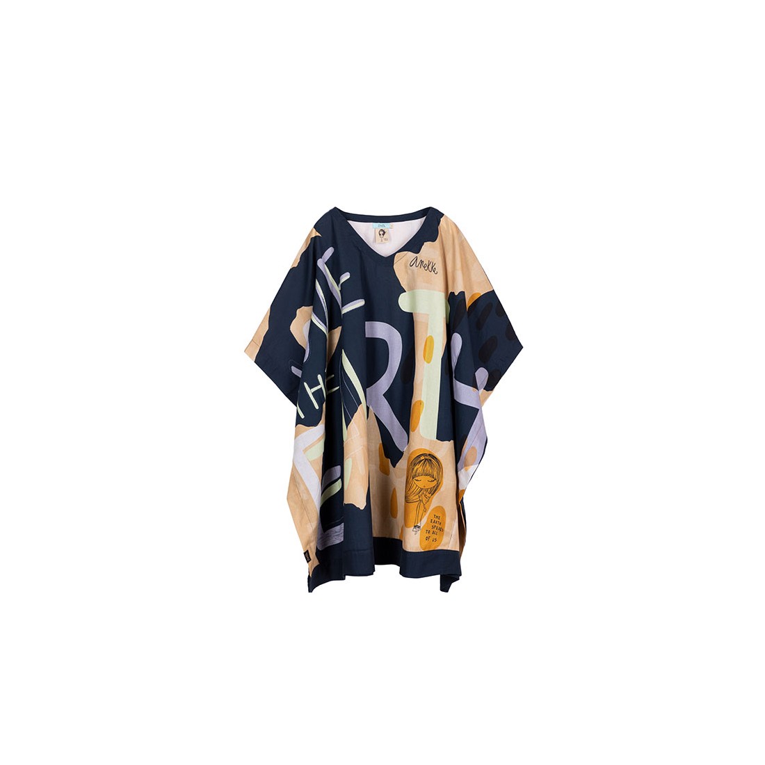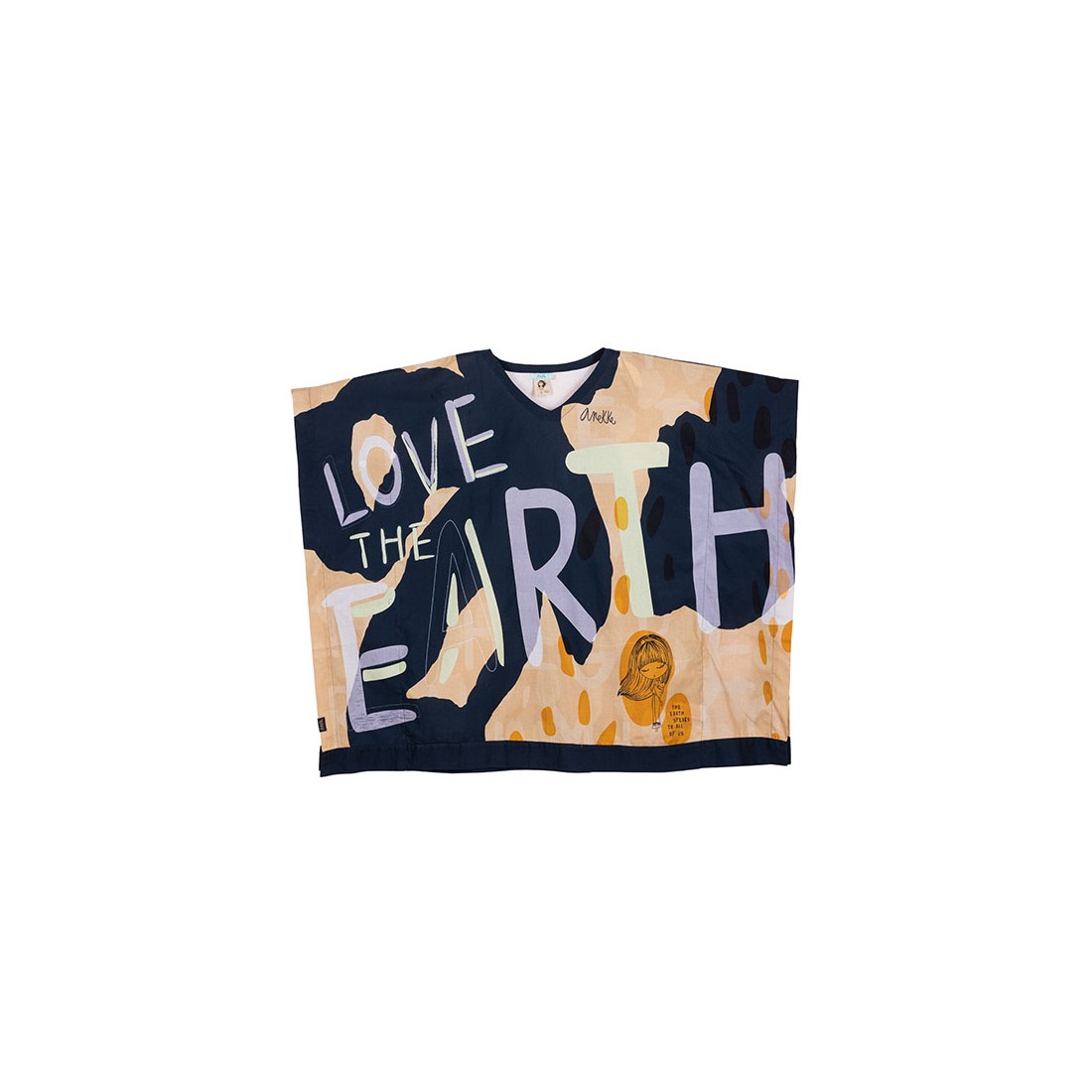 Es un modelo de talla única con escote en V y manga corta, con un original corte ancho y un toque vaporoso. Su diseño en tono azul marino combina con su estampado con toques naranjas, amarillos y violetas, con frases de amor al Planeta.