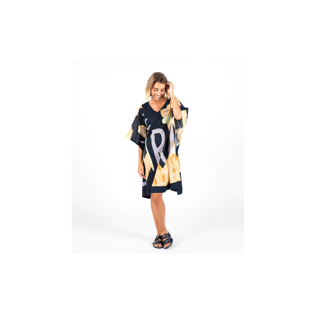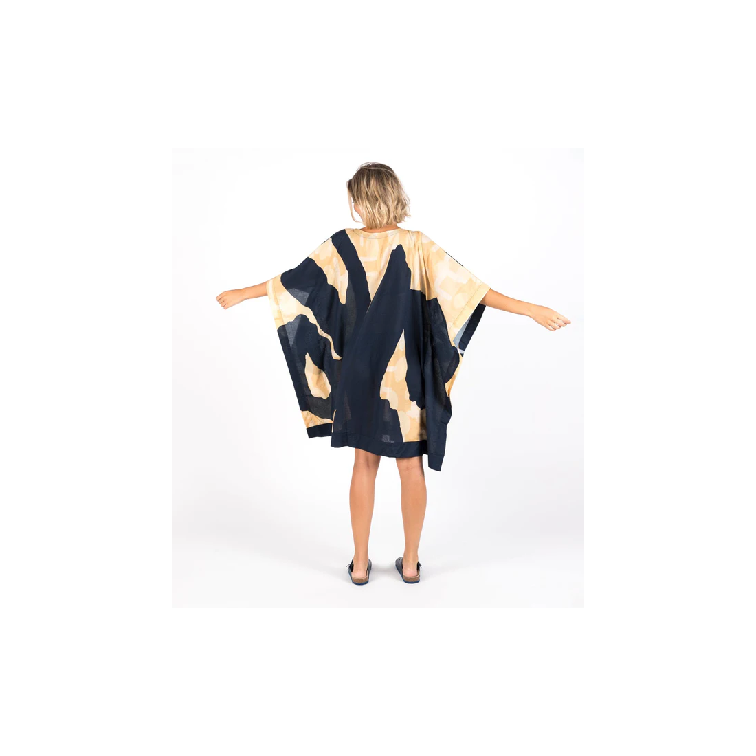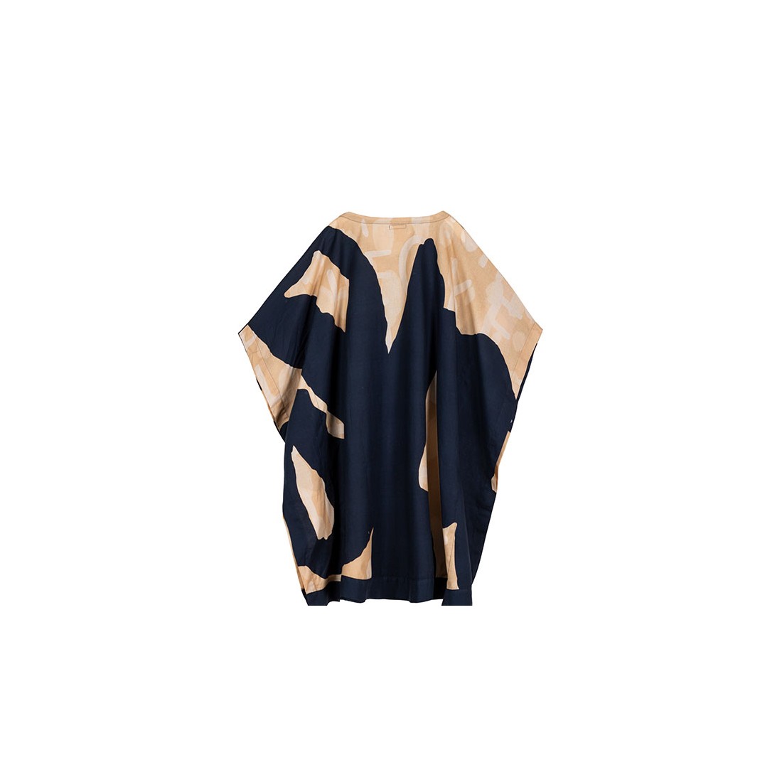 Es un modelo de talla única con escote en V y manga corta, con un original corte ancho y un toque vaporoso. Su diseño en tono azul marino combina con su estampado con toques naranjas, amarillos y violetas, con frases de amor al Planeta.