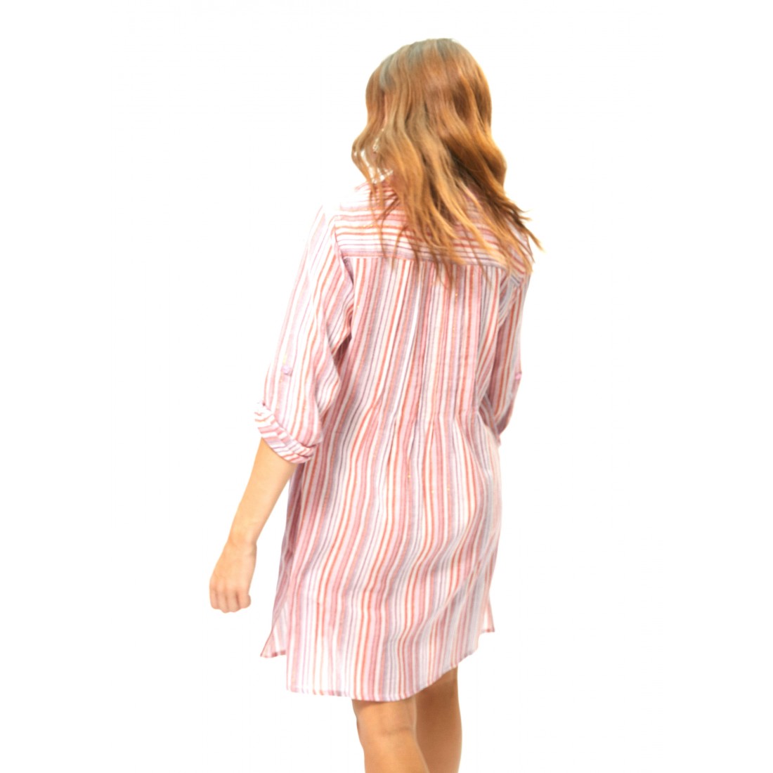 Diseñado con un estampado de rayas combinando colores, cuello mao con detalla de piedrecitas al tono y abotonado de arriba a bajo. De manga larga con posibilidad de acortar con un botón que se encuentra en la misma. Una prenda muy colorida, alegre y muy ponible para este verano en cualquier momento del día con complementos adecuados.