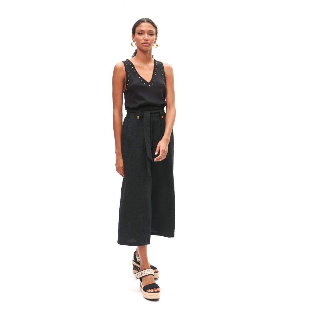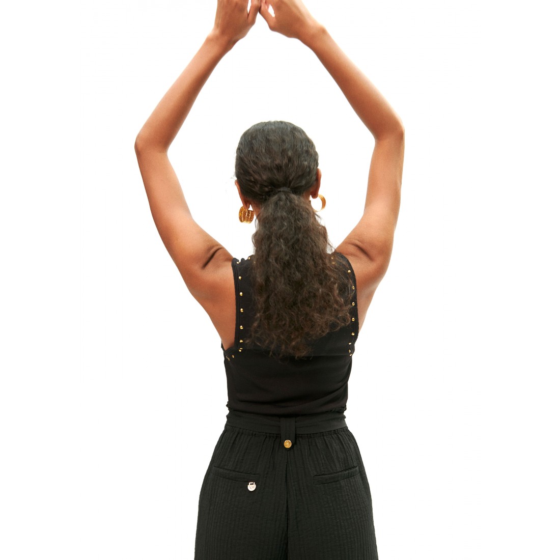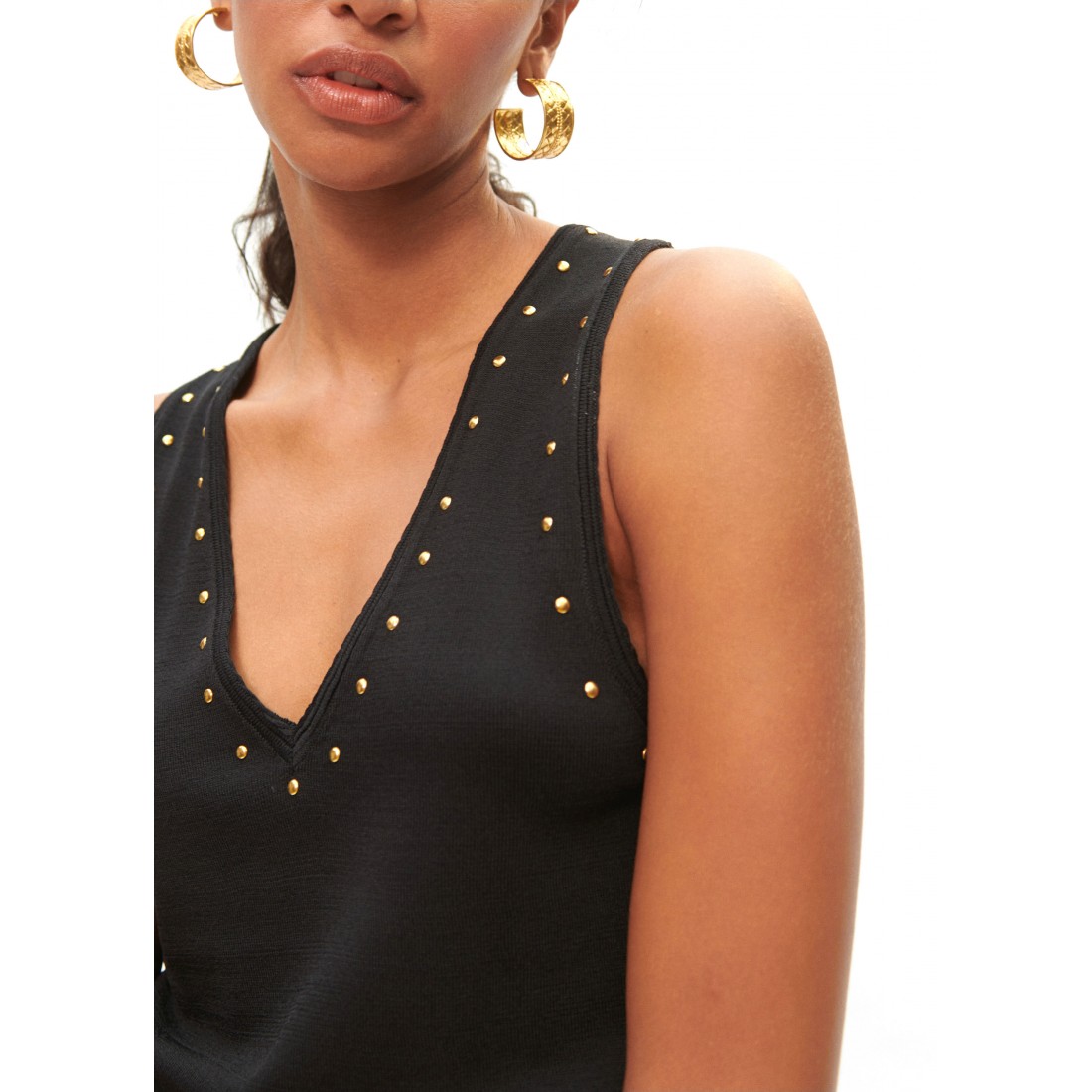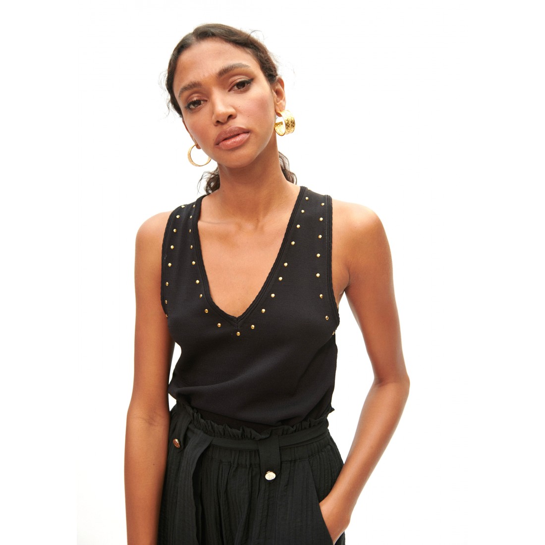 Diseñado en punto, tirantes y cuello en "V"  con detalle de tachuelas doradas en la parte superior frontal y trasera. Una prenda muy versátil, cómoda y combinable con shorts, jeans, falda...